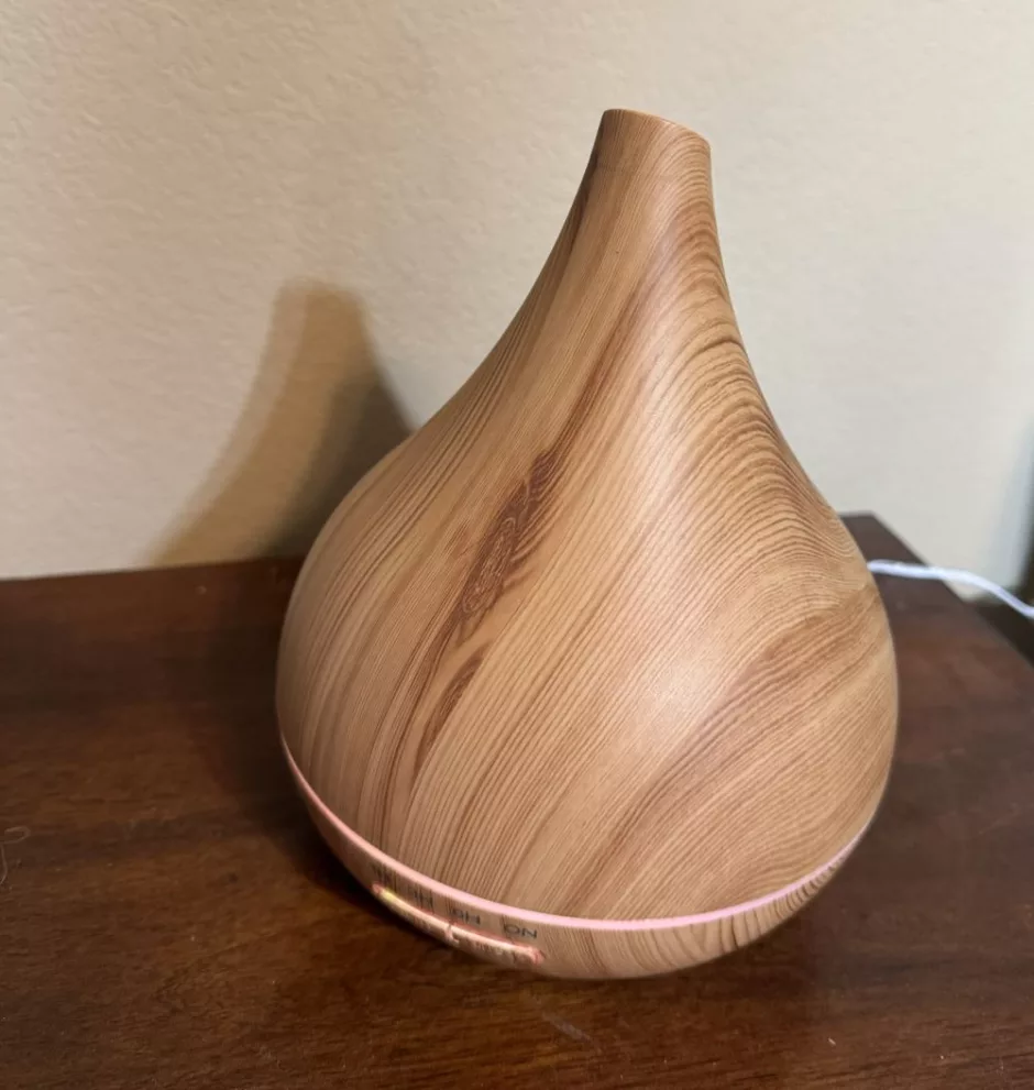 Electric diffusers (this is the one I have) have a reservoir for water and essential oils and a top piece with a spout or hole on the top. They may also include timers and different colors of light to suit your decor or mood.