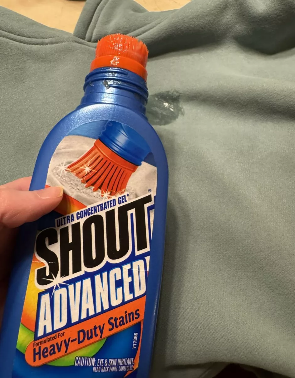 I start most stain removal processes with a stain removing spray or stick. I like this Shout Advanced stain remover stick because it’s a gel so it’s easier to get it where you need it than a spray.