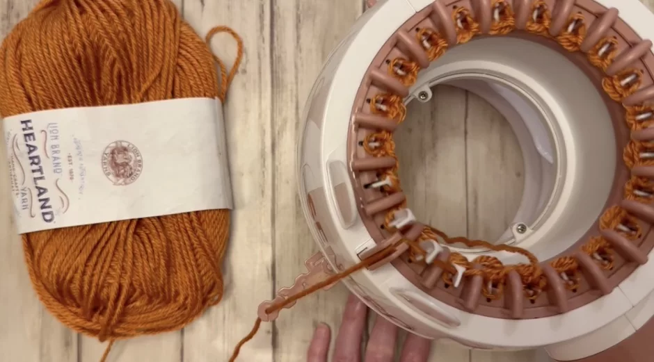 Using your orange yarn, cast on to your knitting machine by putting the yarn in front of the first hook and behind the second around.