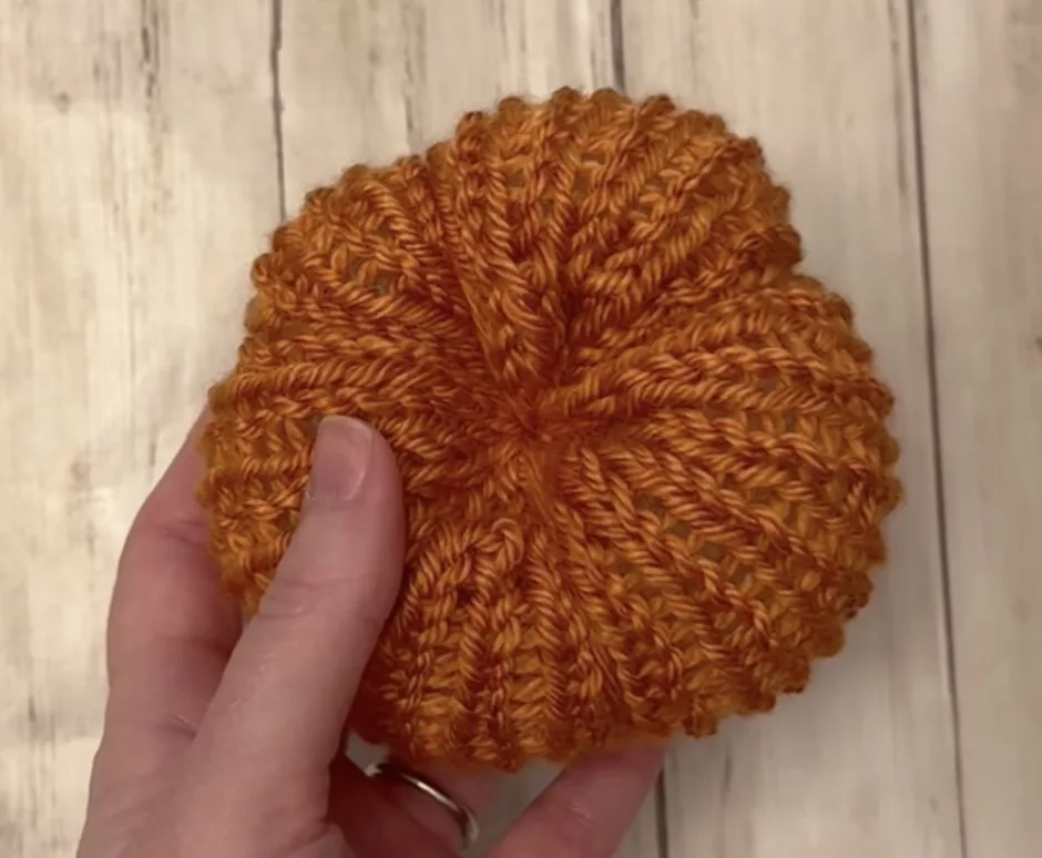 Stuff the pumpkin as desired. It helps to start pulling on the yarn end at the other side as you go to see how stuffed you’re making your knit mini pumpkin.