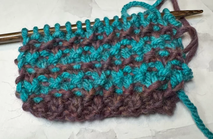 I decided to work with a strand of worsted weight yarn and a strand of something lighter held together. I used a size 10 US knitting needle out of instinct and knowing that I could adjust my stitch count as needed (it worked out fine).