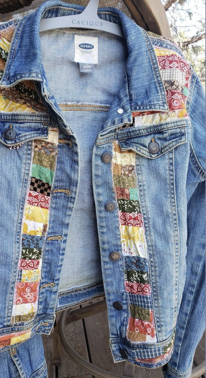 I also love this patchwork-embellished jean jacket that was sold on Etsy but started with a purchased denim jacket from Old Navy. This would be a great way to cover up holes on a well-loved shirt or jacket, or just add patchwork because you want to.