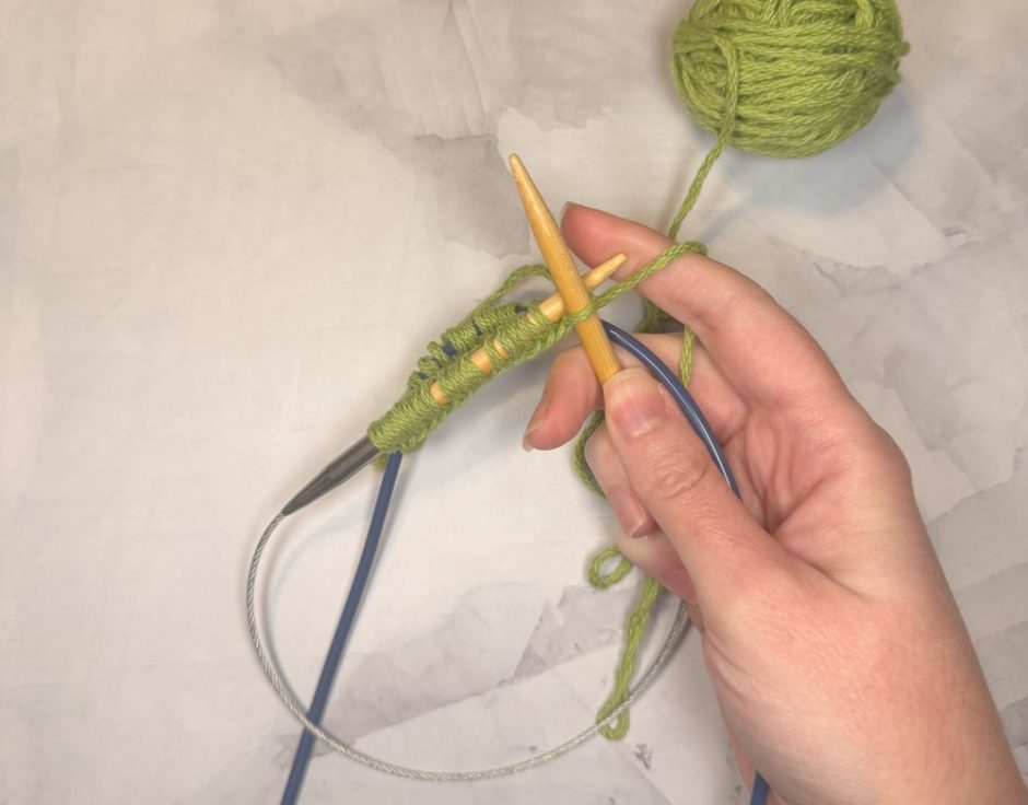 I really like knitting in the round with two circular needles. It feels faster than working with double pointed knitting needles and I think it’s a great option for newer knitters because the needles you aren’t knitting with are out of the way, and because you can slide the stitches you aren’t using onto the cable, there’s less danger of dropping stitches.
