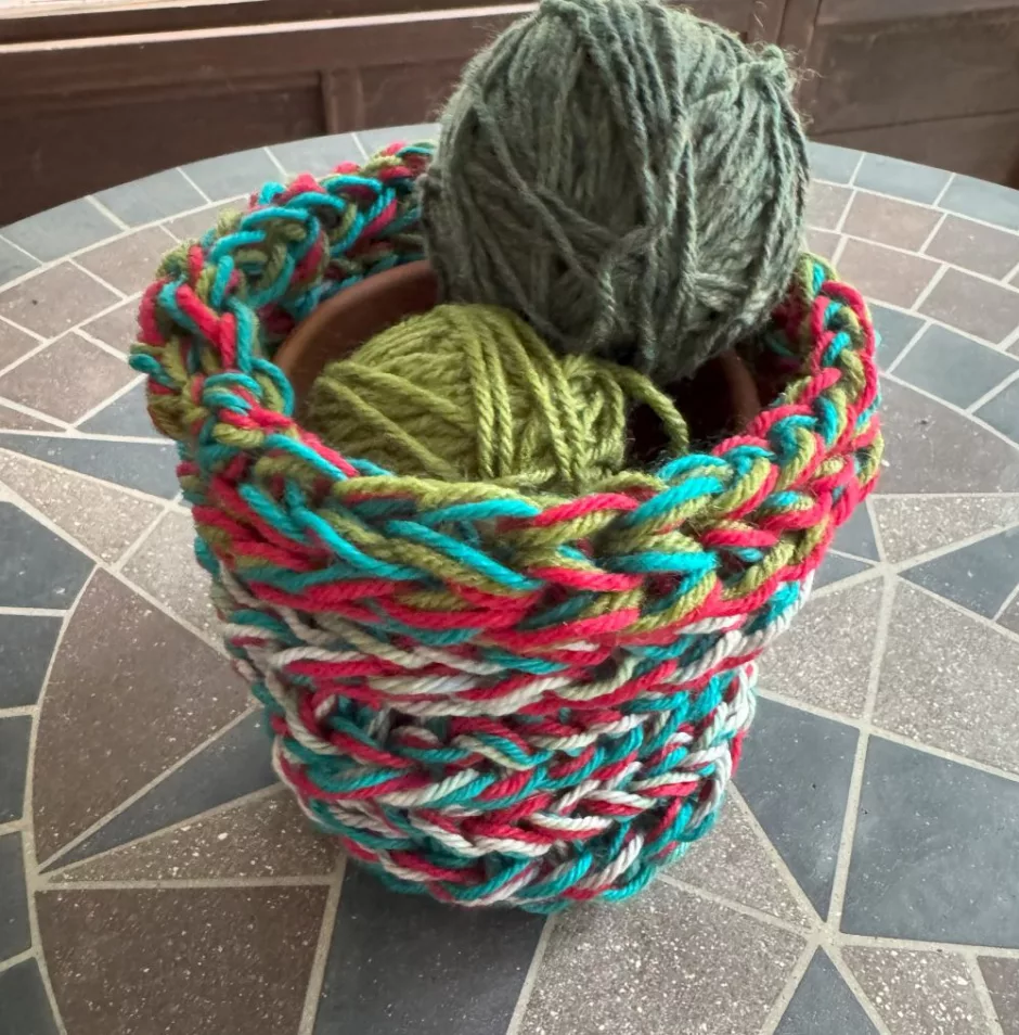 This finger knit basket is really quick and easy to make and a fun way to use some stash. And also hold some stash! You could make one even bigger to use a bunch of your odd balls if you like.