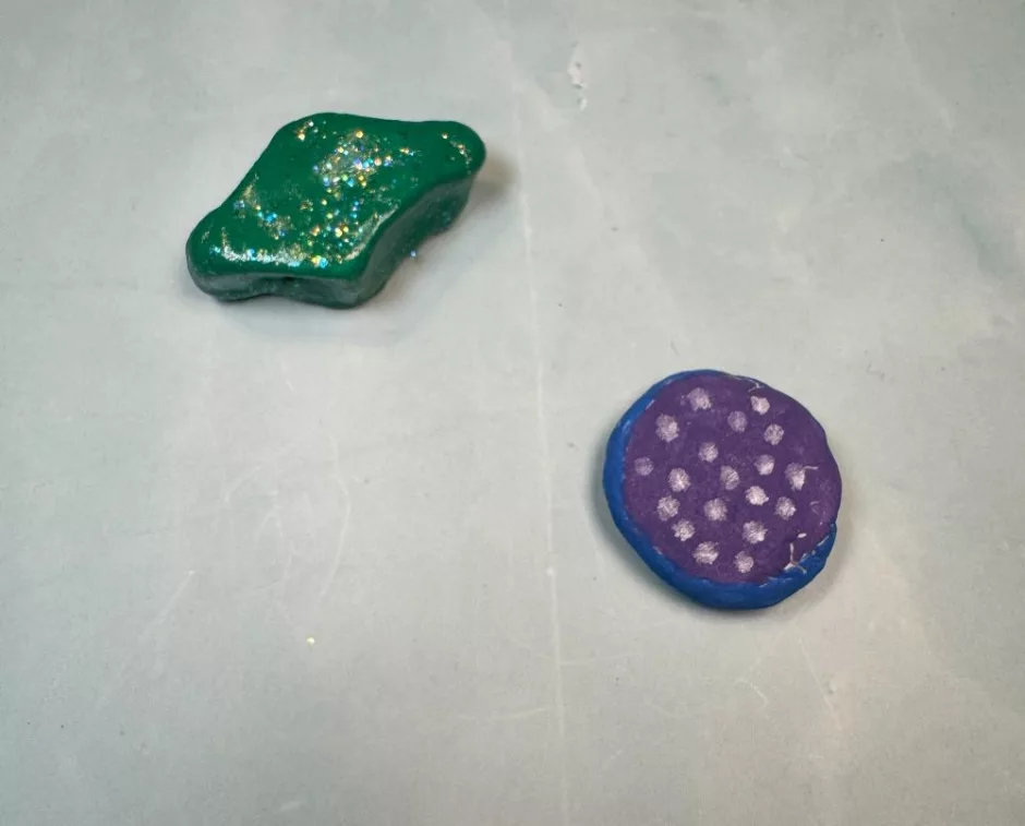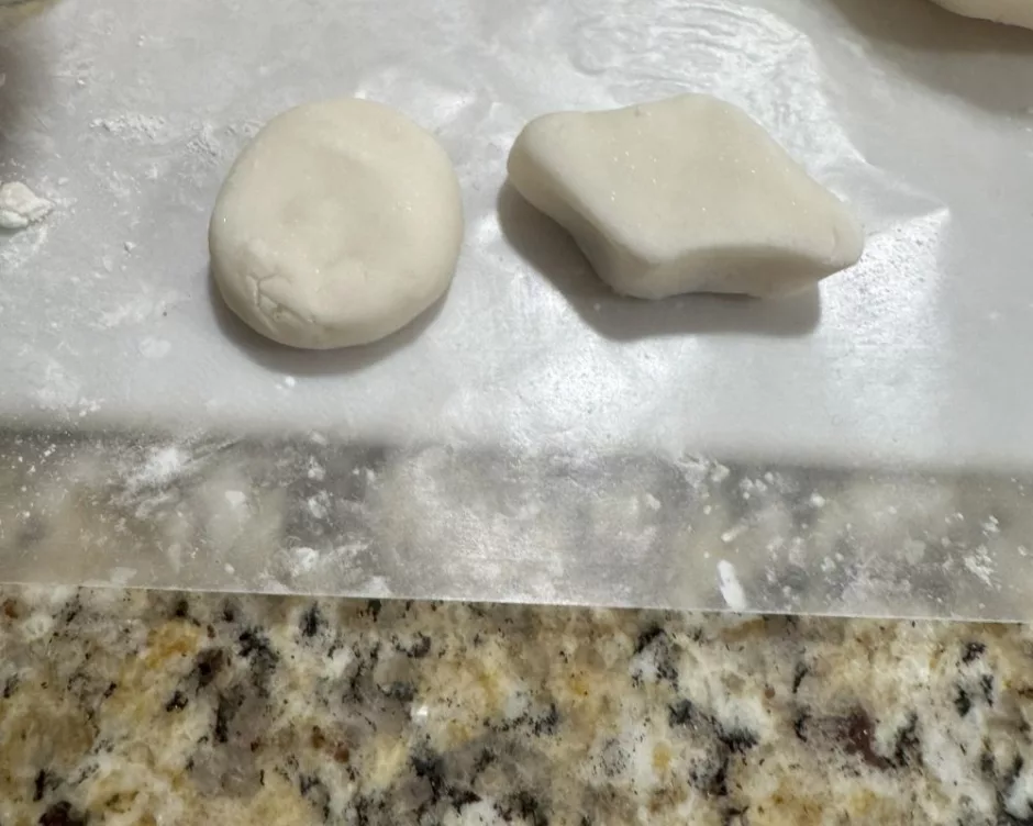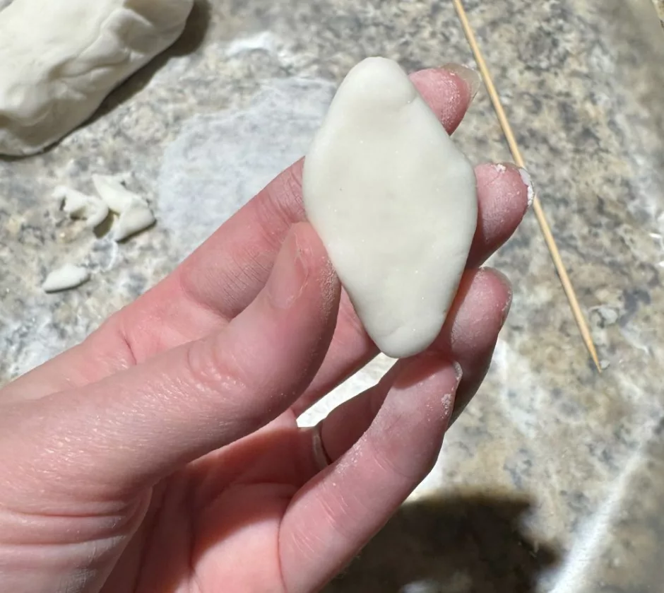 Shape the dough as you like. I made a sort of diamond and a circle. If you have tiny cutters like you’d use with polymer clay, you might be able to cut out a shape, or you can just do it freehand.