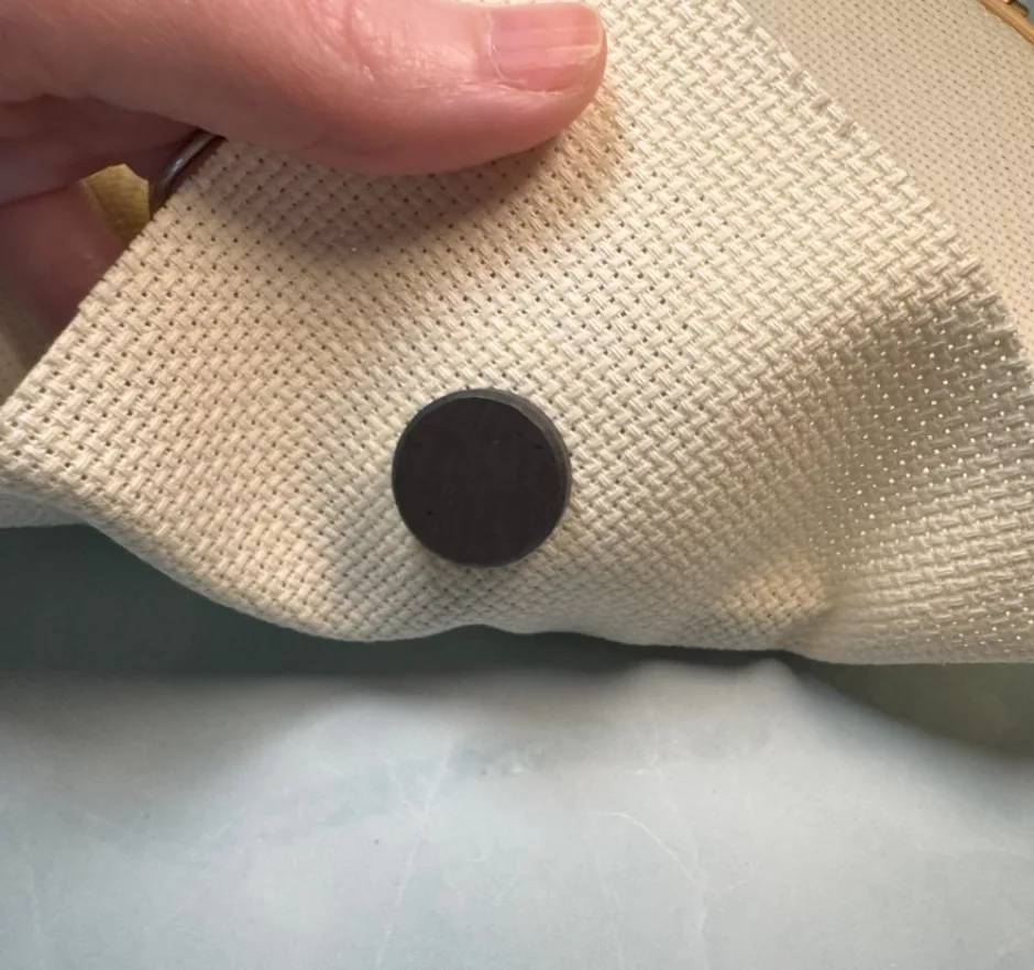 To use your DIY needle minder, place a magnet at the back of your fabric and place the needle minder on top. Add your needle.