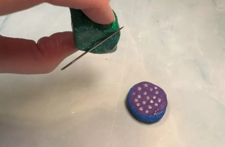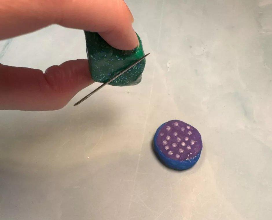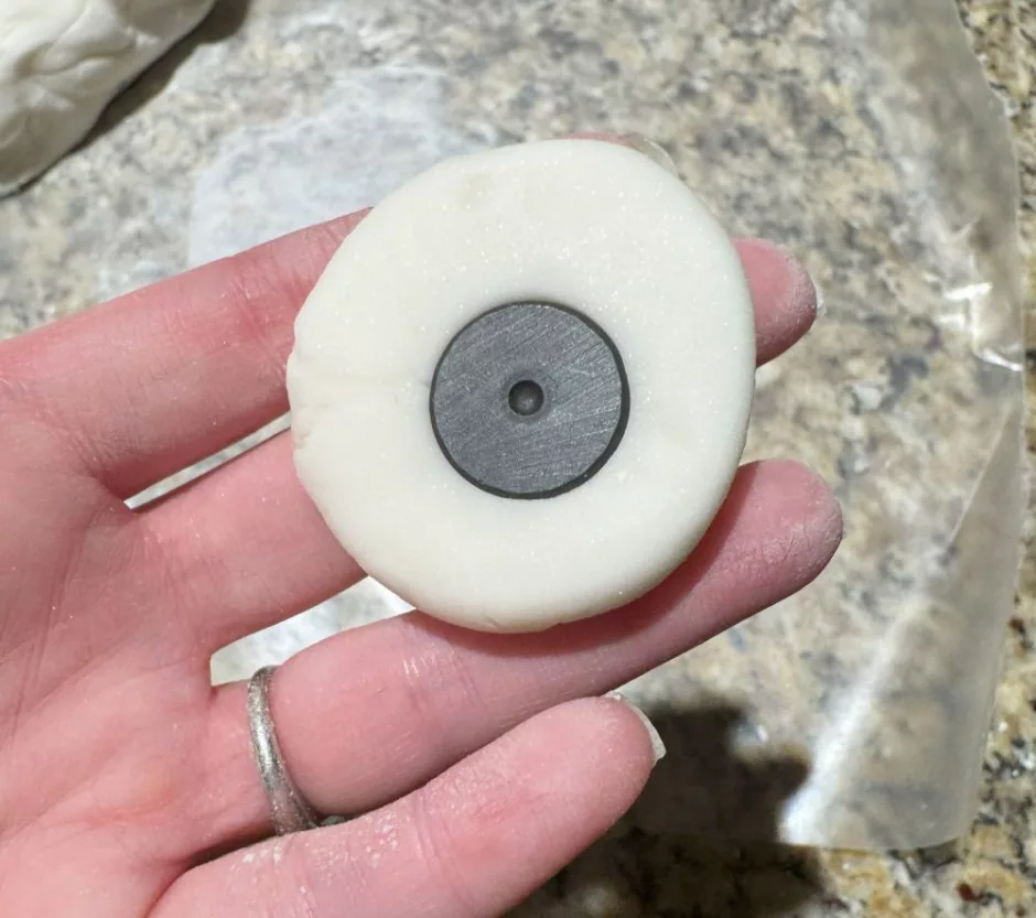 Start with a small ball of clay and flatten it a bit, then stick your magnet into the dough on the back. I used button magnets because that’s what we have in the house. The size and shape of your magnet will determine the size of your needle minder.