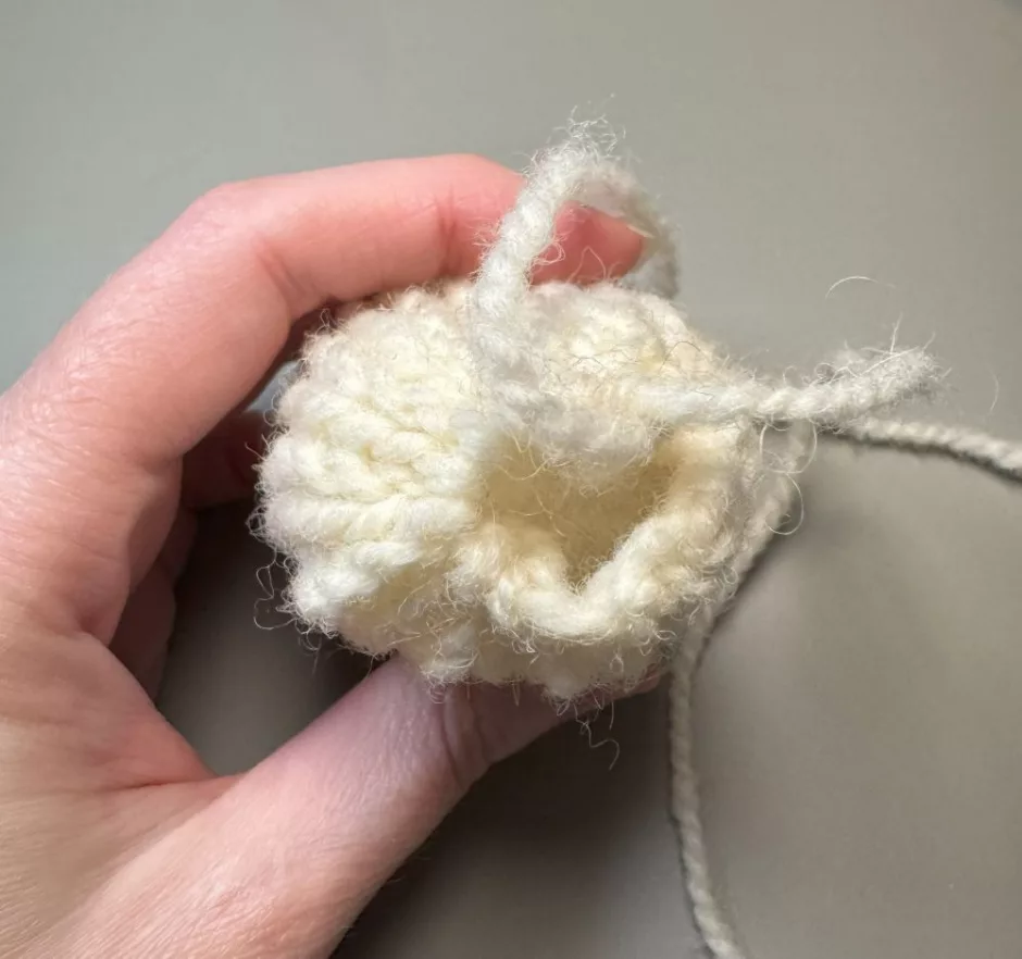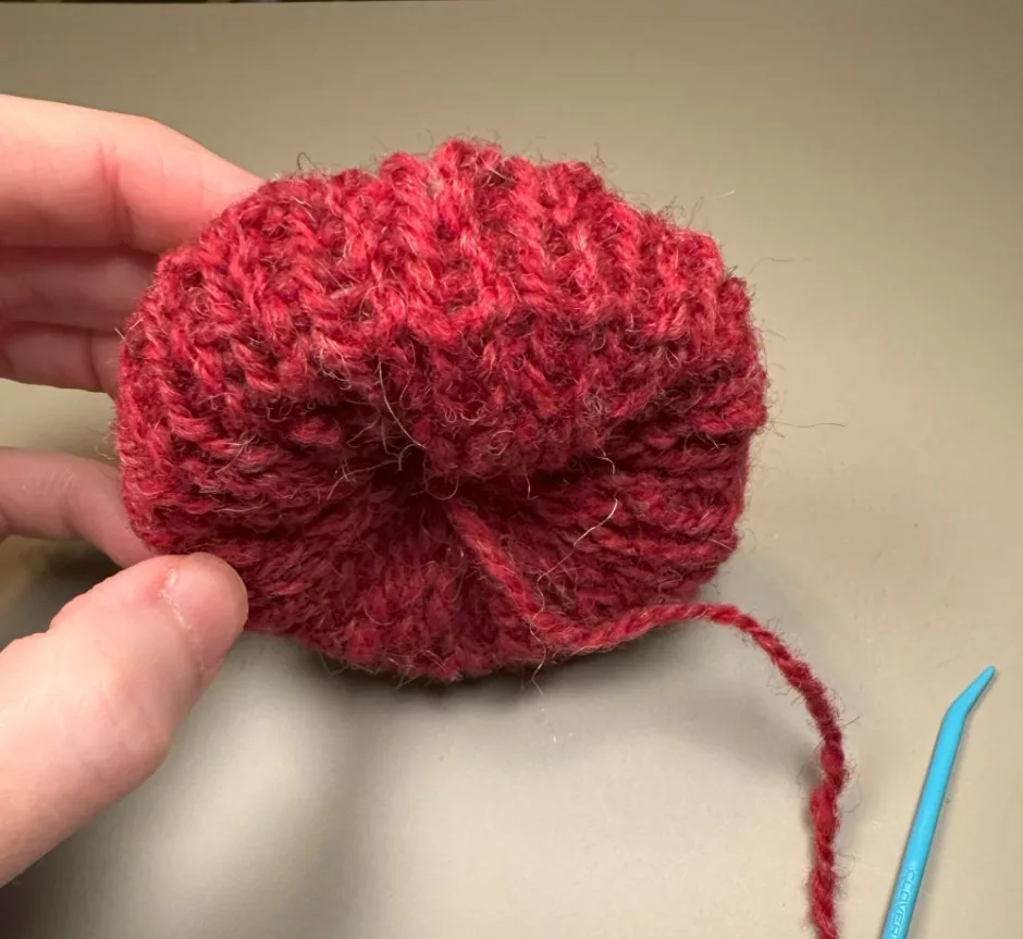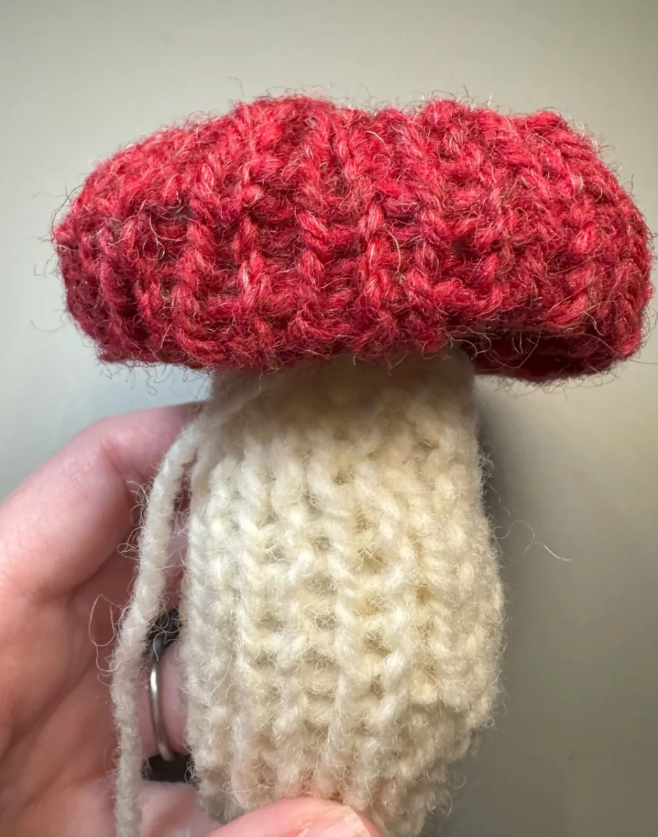 Begin to pull on the yarn from the cast on edge (the bottom/inside of the mushroom cap) and stuff the cap to your liking. I just put a little bit to help it hold its shape, but you can make a big bulb if you like.