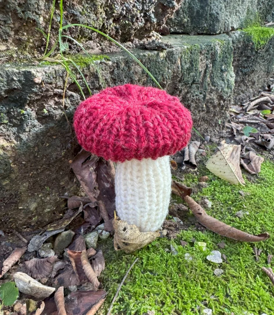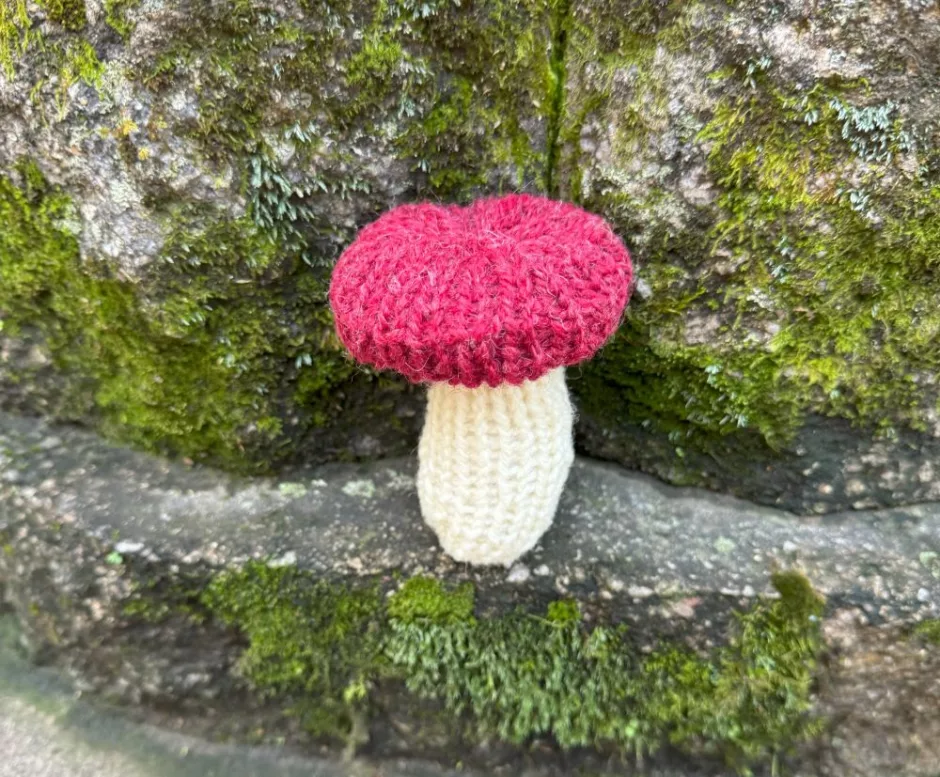 If you like you can add stitching to the top (before you bury the ends) to make it look more like a Fly Agaric mushroom. Or you can add a face to the stem, or embellish in any way you like. There are lots of ways to make this knitting machine mushroom your own.