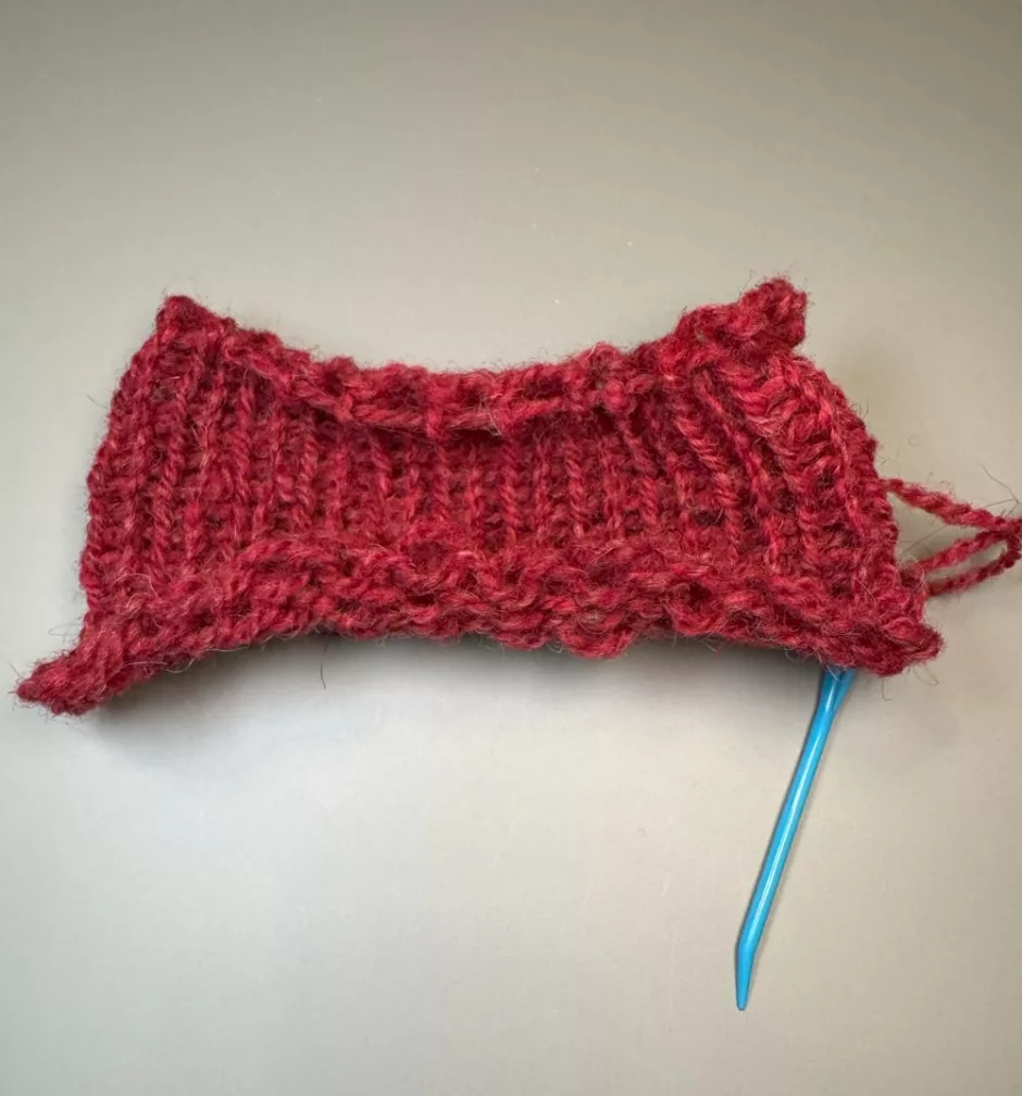 My red yarn is Bartlett Yarns 2 ply in Mountain Berry, while the white is Briggs & Little Heritage 2 ply in Washed White. While they’re lovely yarns (and Bartlett is a great American yarn company), they weren’t the best for knitting on the Sentro, so use what you have and see if it works for you.