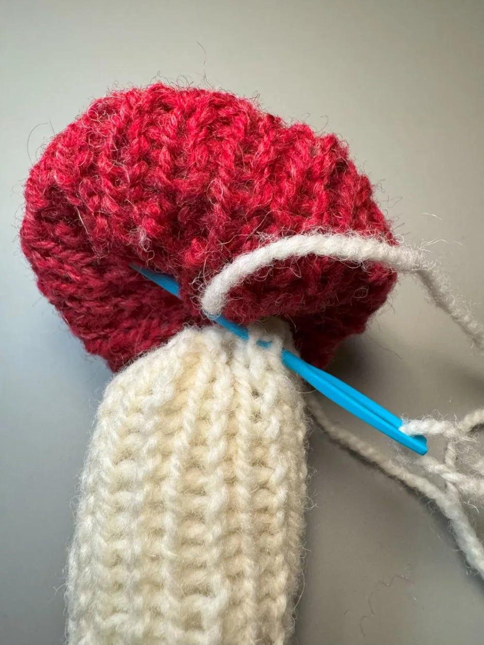 Use either white yarn end to sew this end of the stem to the bottom of the mushroom cap.