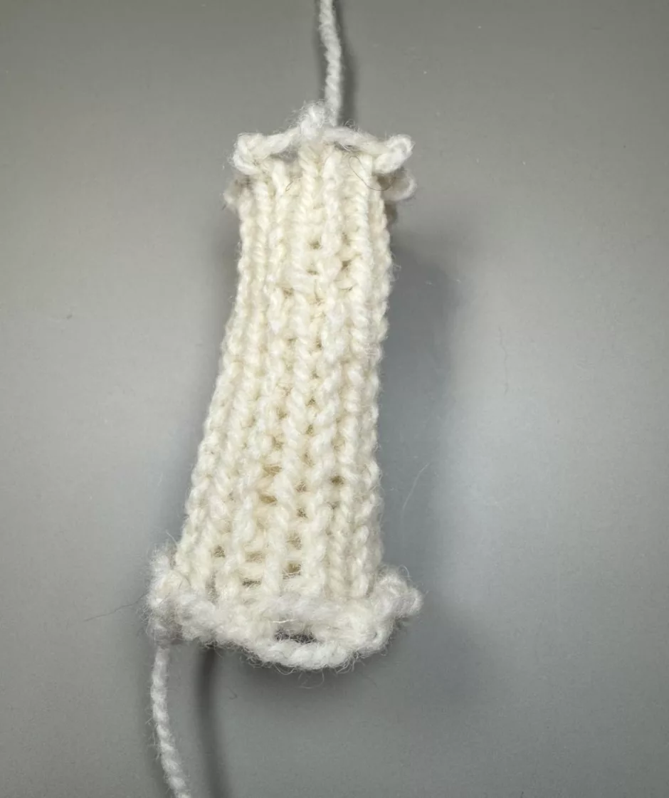 Cut yarn, leaving a long tail. Thread the yarn onto your yarn needle and crank one more row, picking up the stitches and putting them on the yarn as you go.