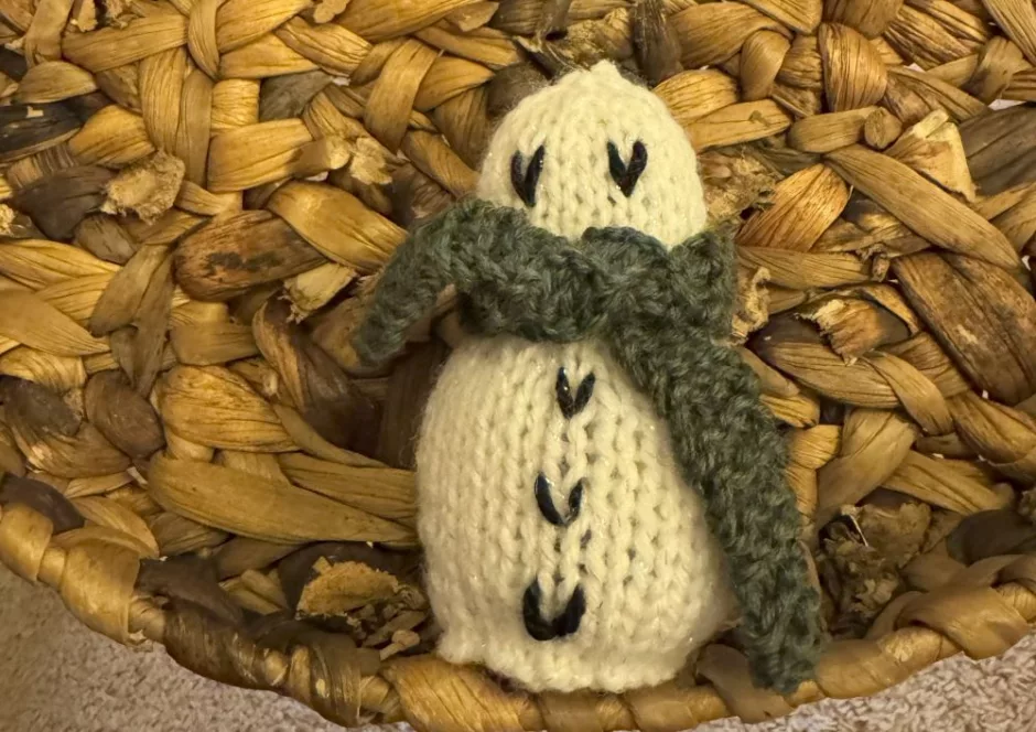 This knit mini snowman can sit on a table or you can make it into a Christmas ornament a gift bag decoration. It doesn’t take long or a lot of yarn to make and it can be embellished in lots of different ways. Let’s get to knitting!