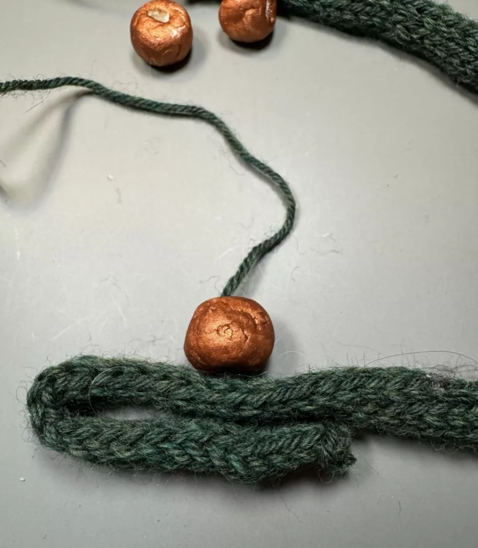 You can make your tree simple like my dark green one or embellish it with beads, in which case you will need beads. The copper beads are homemade air dry clay beads (you can see them in this post about preventing cracks in air dry clay) while the others are mostly transparent pony beads, with one solid brown bead to be the trunk of the tree.
