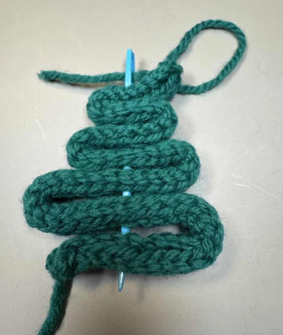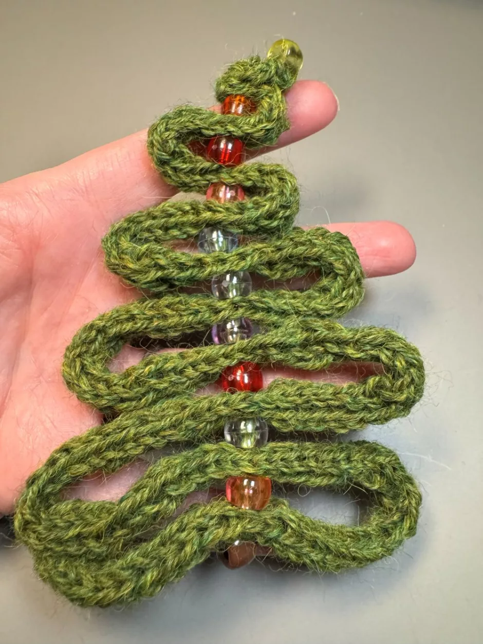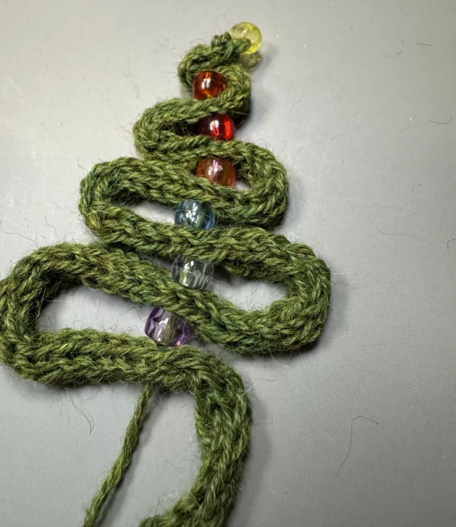 If your knit I-cord ornament has a bead at the top you can use that to add your ornament hook, or just hook it onto a stitch of the cord at the top of the tree.