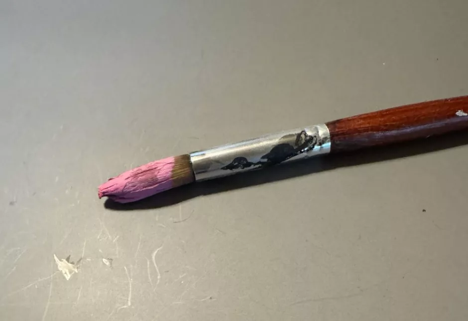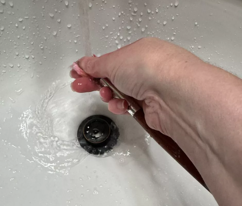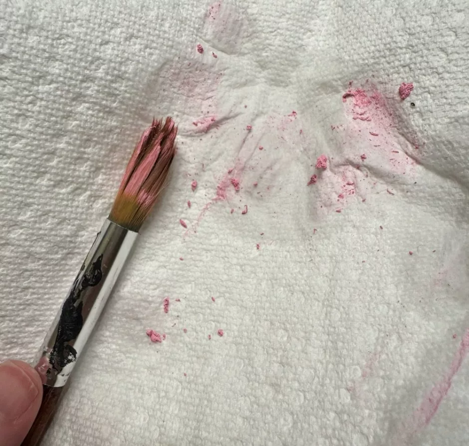 Next you’ll want to rinse the brush and pick away the paint. I tend to use my thumbnail for this, but you can use your cleaning toothbrush if you have one (and you should — it’s the best thing for cleaning jobs like getting blood out of fabric).