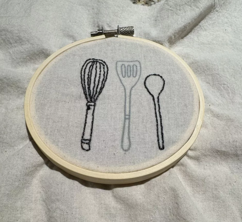 Once you’ve learned how to use iron on embroidery transfers, you’ll want to use them for all sorts of things. I think this utensil one is going to become a panel on a bag, the sewing machine will be a Christmas ornament, and I think the brushes would be cute as a patch added to a notebook or art journal.