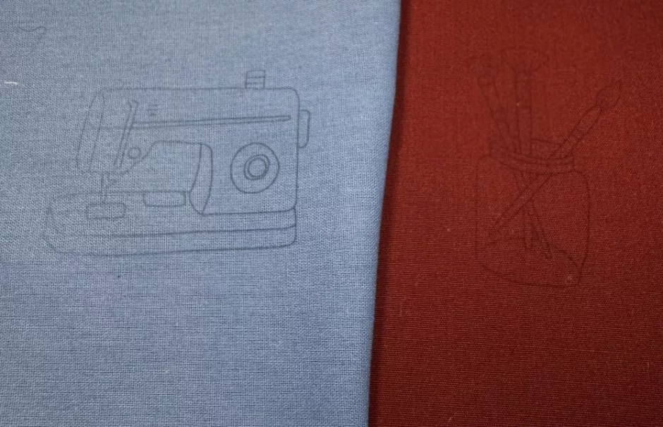 What if you want to use the iron on designs on darker fabric? Here the blue fabric is part of an old sheet, and the red may be polyester but it did fine with the hot iron. The lines aren’t as visible on these but they’re workable.
