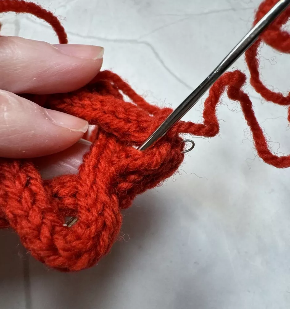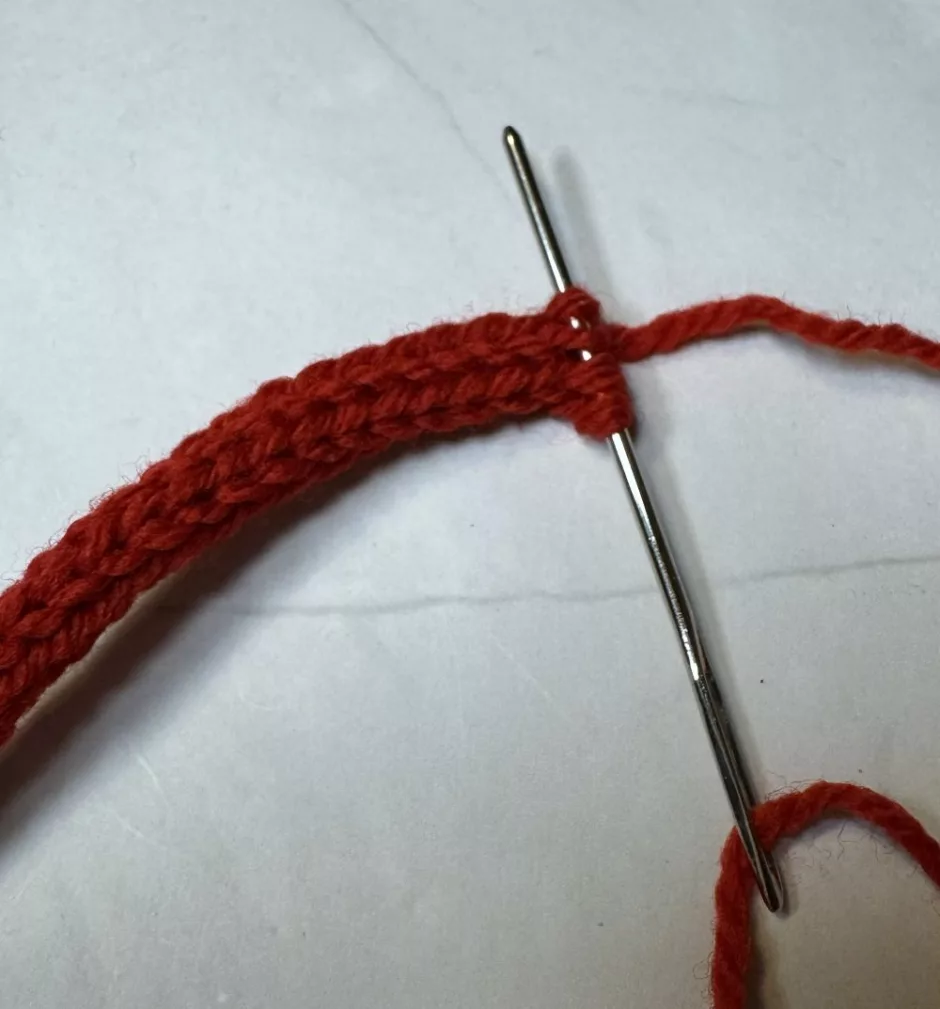 Once you have it the way you’d like it, take your yarn tail and sew the pieces together where they overlap. Run the needle inside the cord to get to the next spot. This should be relatively invisible, but your ornament can have a front and back if it’s not perfect.