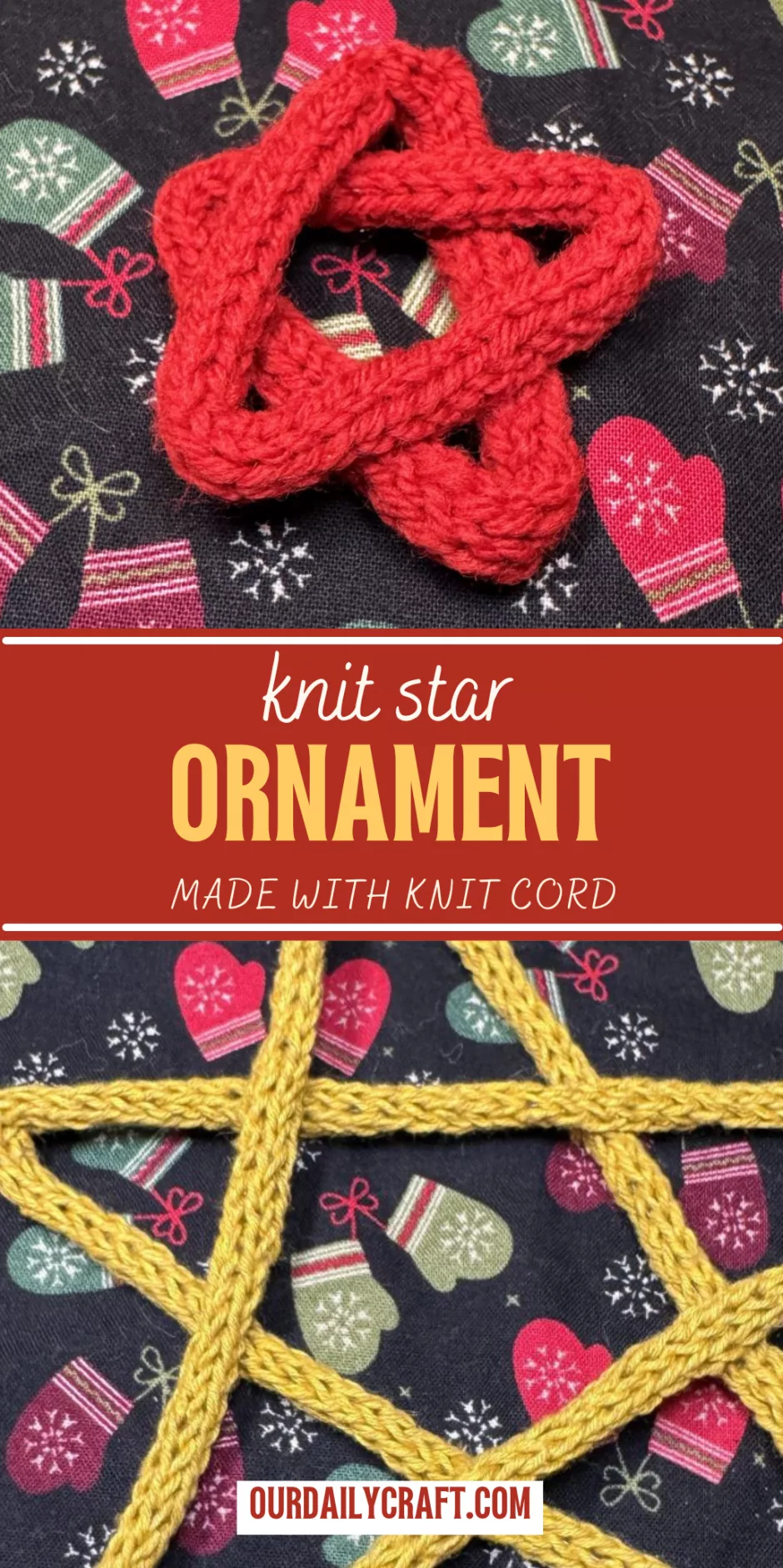 You can make your knit star Christmas ornament any size you like. My red one is about 2 inches tall and 2 inches across (that’s 5 cm), while the gold one is about 6 inches/15.24 cm.
