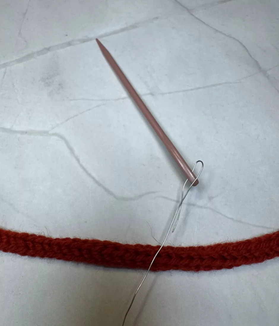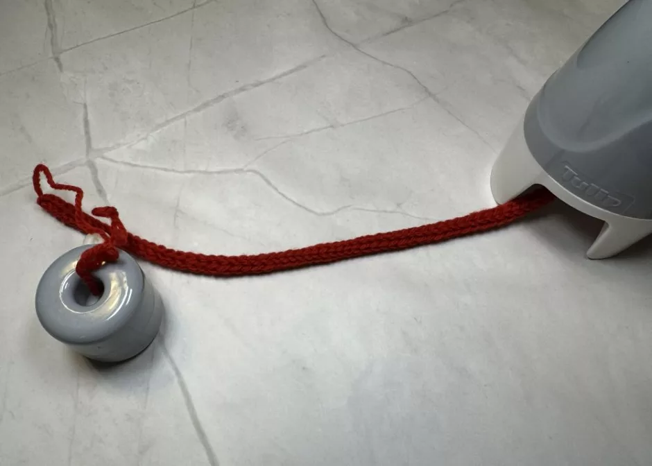 When you’re done, bind off and leave a long tail, or, if using a machine, cut the yarn, leaving a long tail, remove the cord from the machine and use the yarn needle to take the yarn end through the stitches so they won’t unravel.