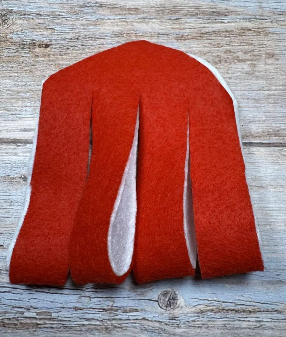 Fold the pieces in half and cut through them together, making three cuts so you have four pieces to weave on each pieces. Don’t cut too high because again the curved parts will be the top of the heart.