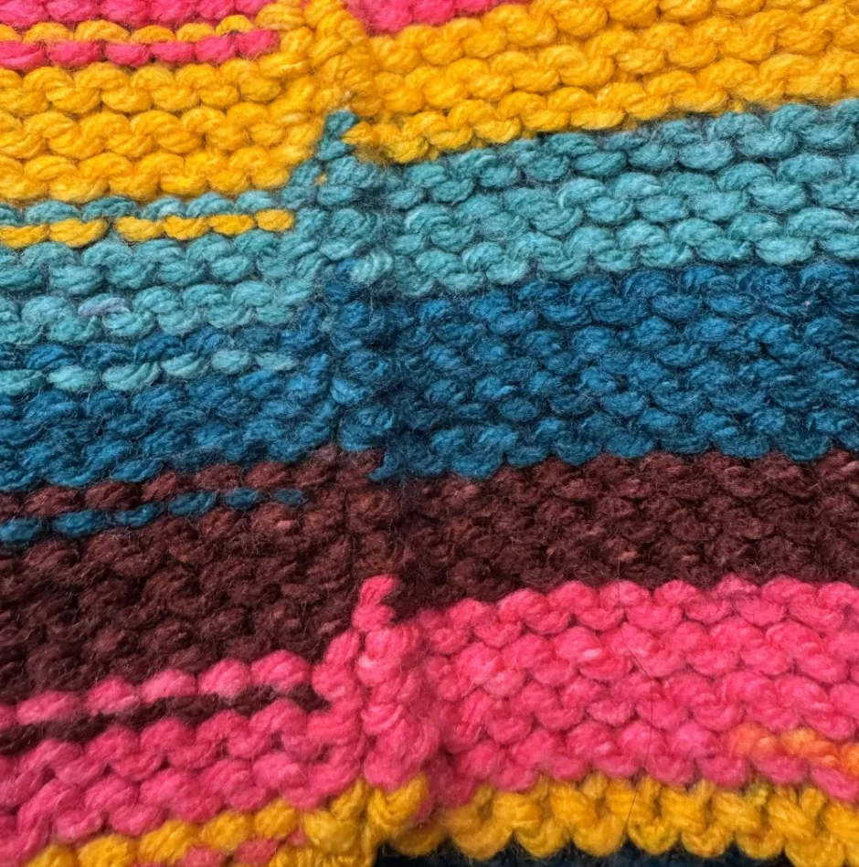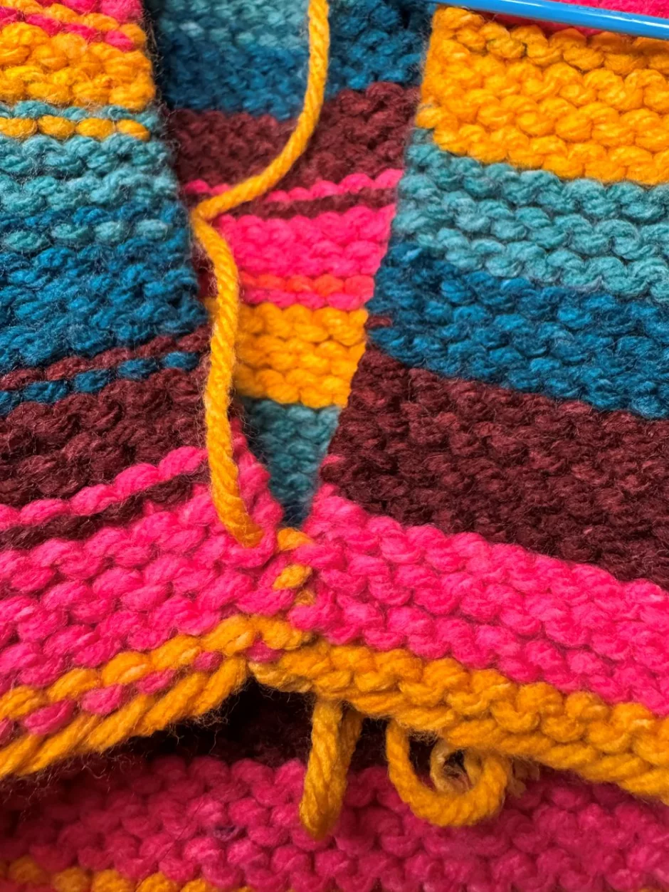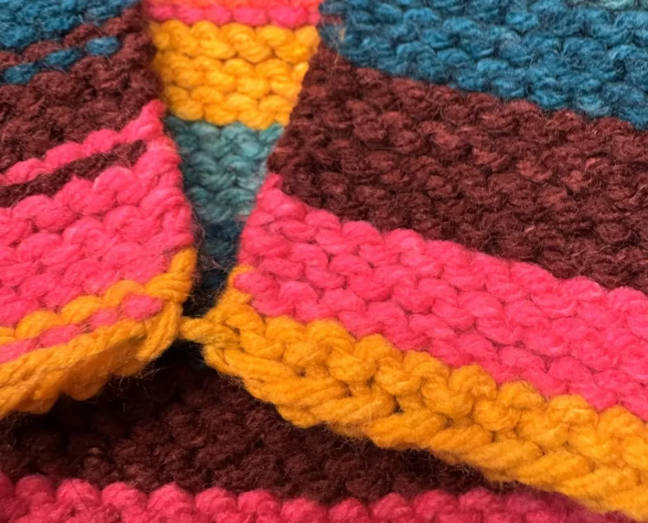 It should be noted that because I’m showing seaming garter stitch on multicolored yarn with a solid colored piece of yarn (Red Heart Super Saver O’Go, to be precise), you can still see the yarn from the seam when it’s finished. I think this is helpful for seeing where the yarn is going, but if you’re working with a solid color yarn and matching yarn on the seam it will be invisible.