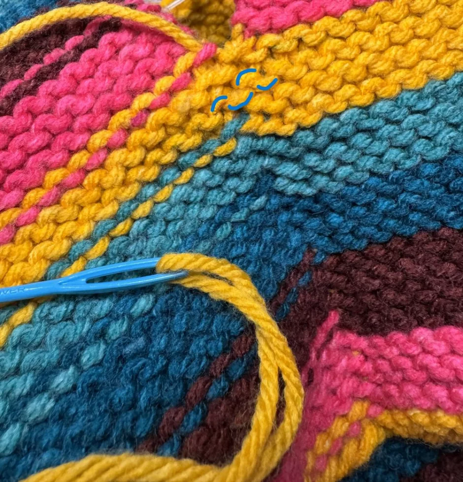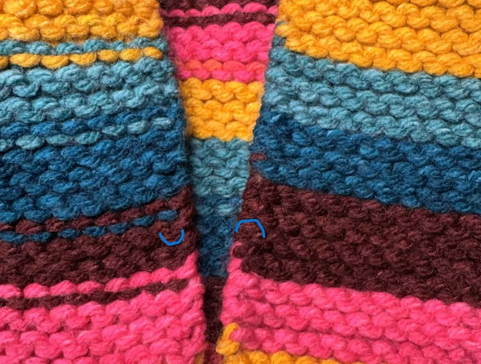 As mentioned above, here you can see a little bit of the yarn used for the seam because it’s not the same color as all of the surrounding yarn. But if you look in the yellow sections you’ll see that the yarn is pretty well hidden, and that the lines of garter stitch are uninterrupted across the seam. (Again shown in blue above.)