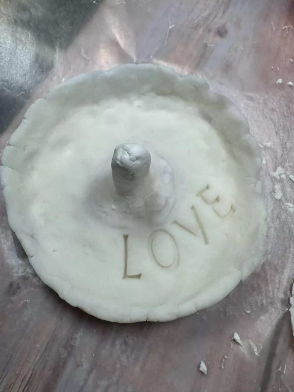 If you want to do any embellishing while the clay is wet, do it now. I stamped the word love. Pressing beads into the clay and leaving them to try would also be pretty, or you can make imprints on the surface if you like.
