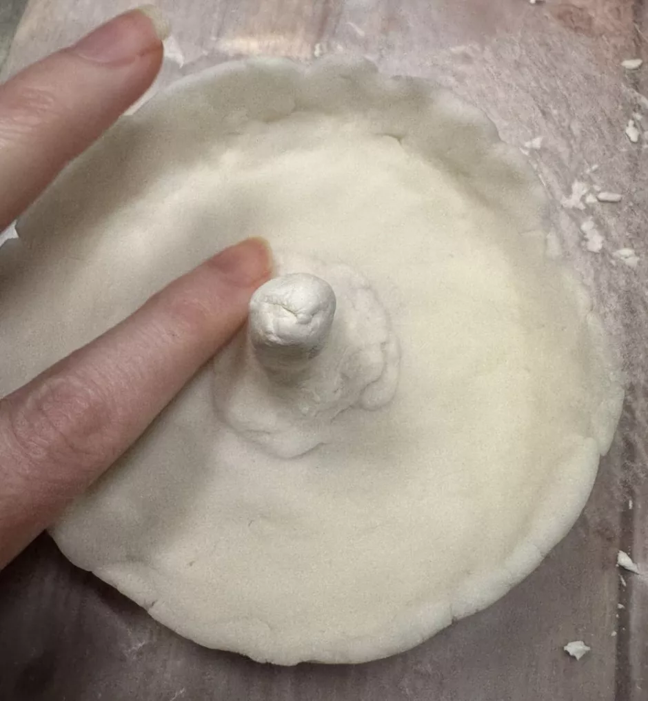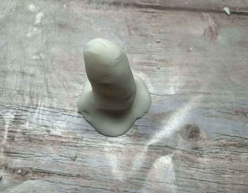 Once the tray part is done, shape the center holder. This sort of looks like a tall wizard’s hat that doesn’t come to a point. The base should be wide so it can attach to the center of your ring dish. Make sure your ring will fit on it and slide at least most of the way down and that it doesn’t seem too tall (I had to try a few times to get mine narrower at the base and then I wanted it shorter).