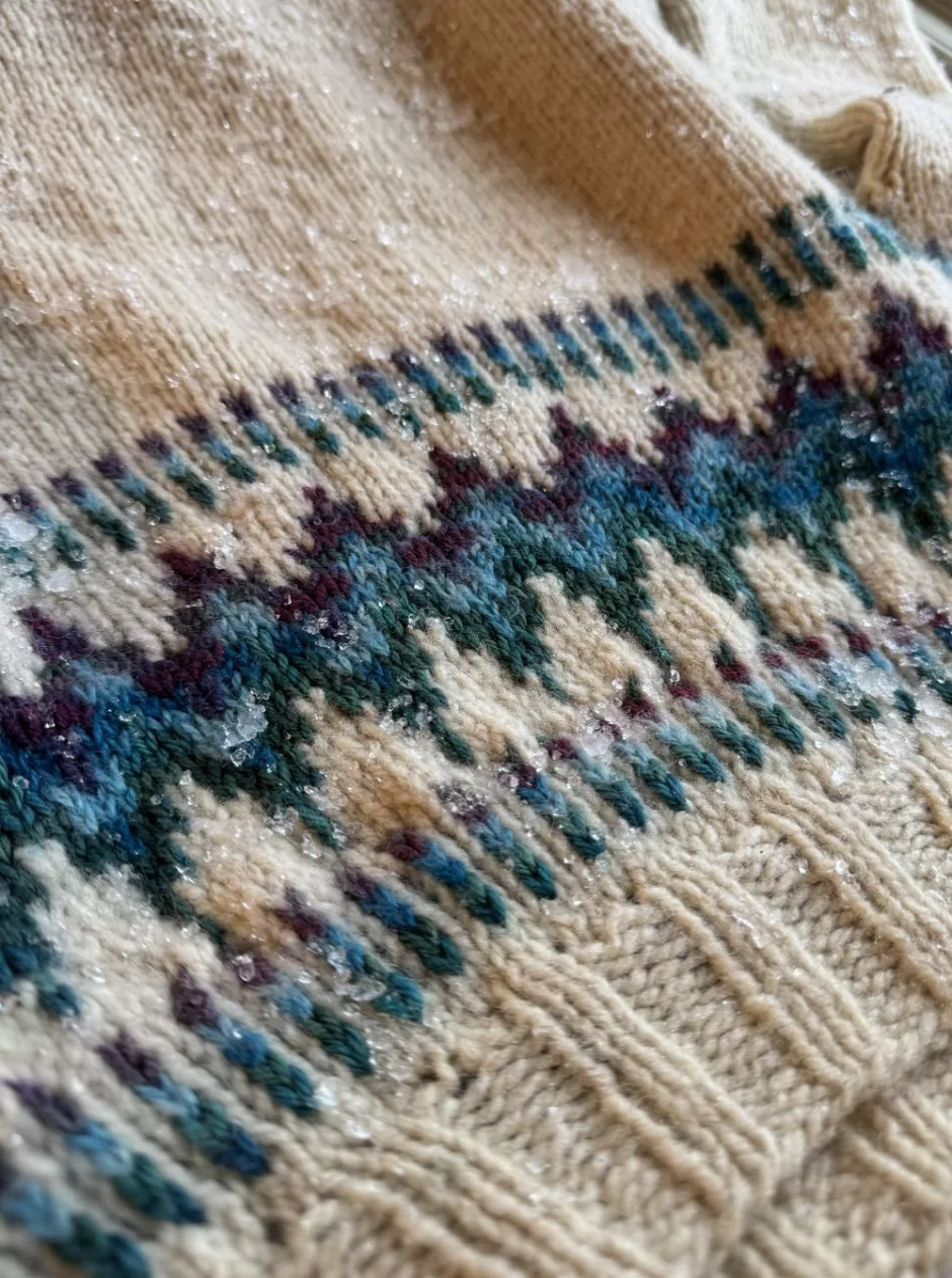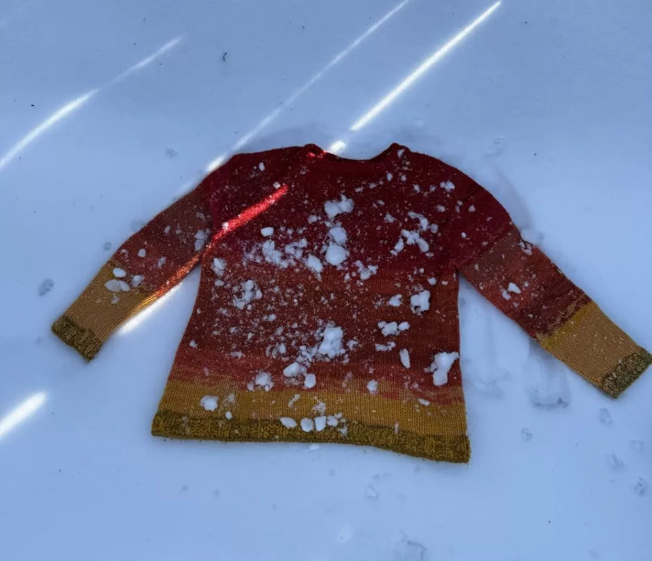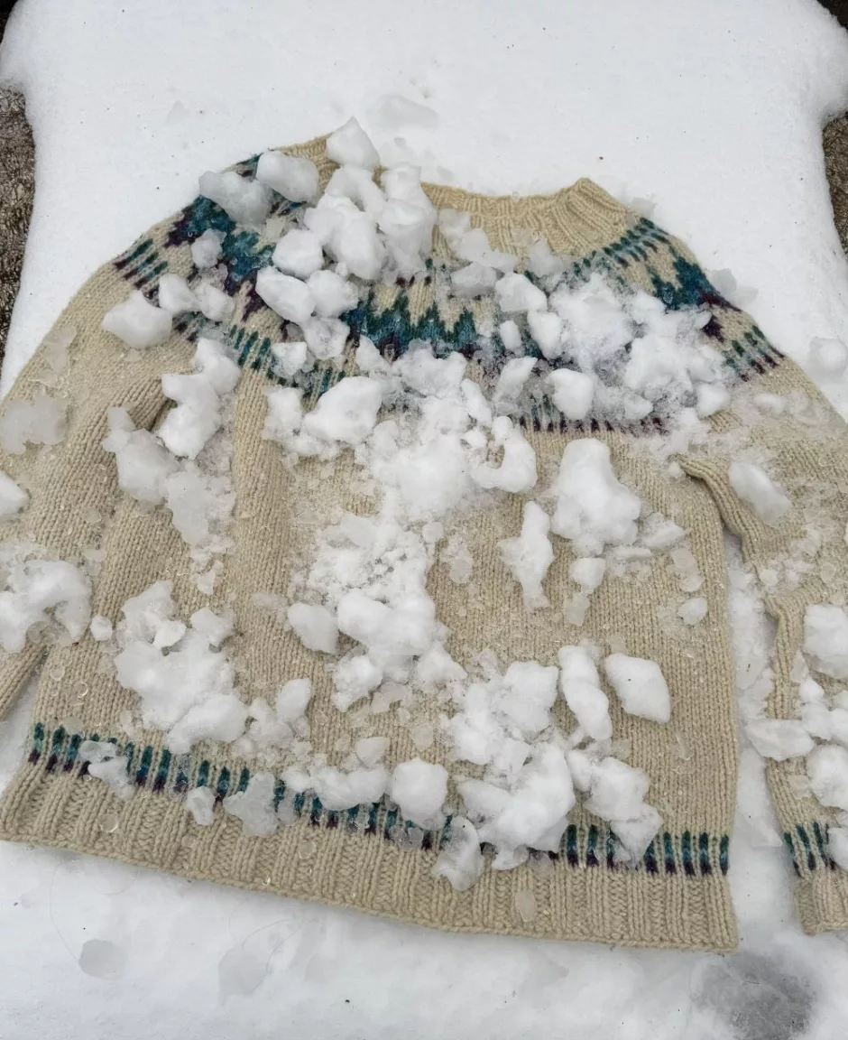 Some say that the freezing temperature of the snow helps kill bacteria that might be on your sweater, as well as moth larvae, which makes sense because freezing is a way to treat knits and yarn when you’ve had a moth infestation.