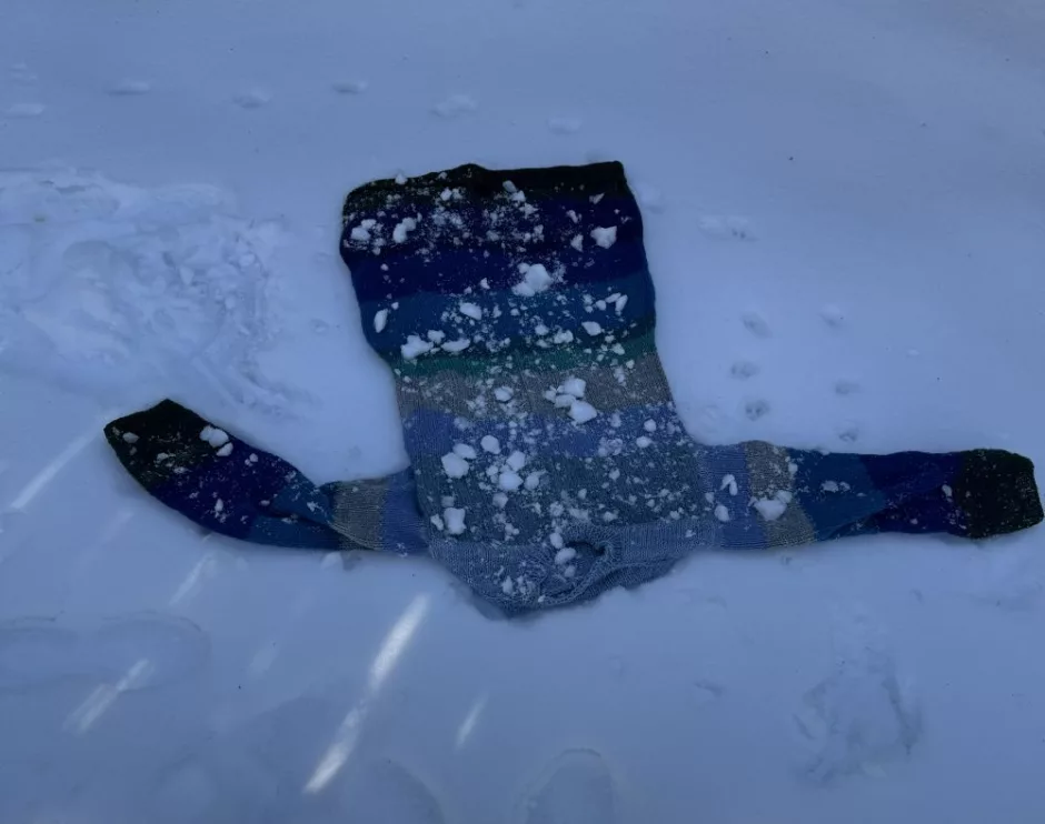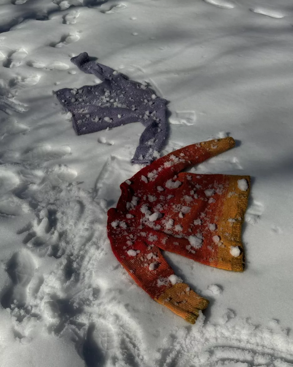 Flip the garments over and cover the other side. If your snow is fluffy and the sweater is fully covered, flipping might not be necessary. But this snow was hard (the sweaters left imprints in the snow) so I felt like it needed more thorough coverage on the other side, too.