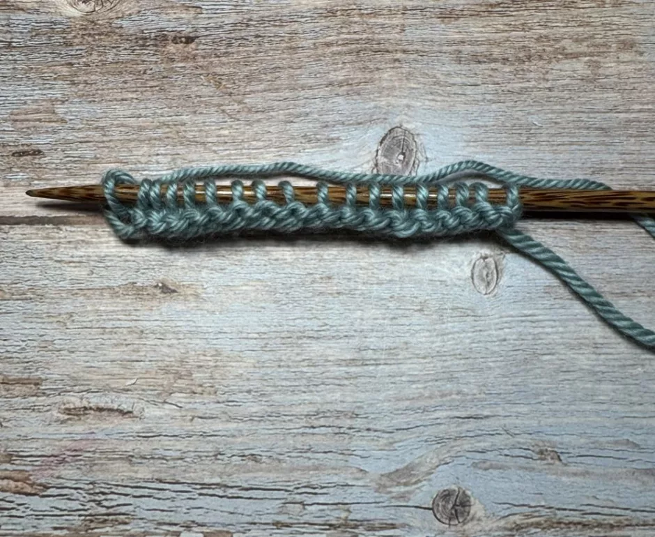 If you’re on the other side you’ll see a whole row of purl bumps below your needle. Look at the stitch in the row below that to determine whether your row needs to start with a knit or a purl. This is a purl so the next row is knit 1, purl 1 across.