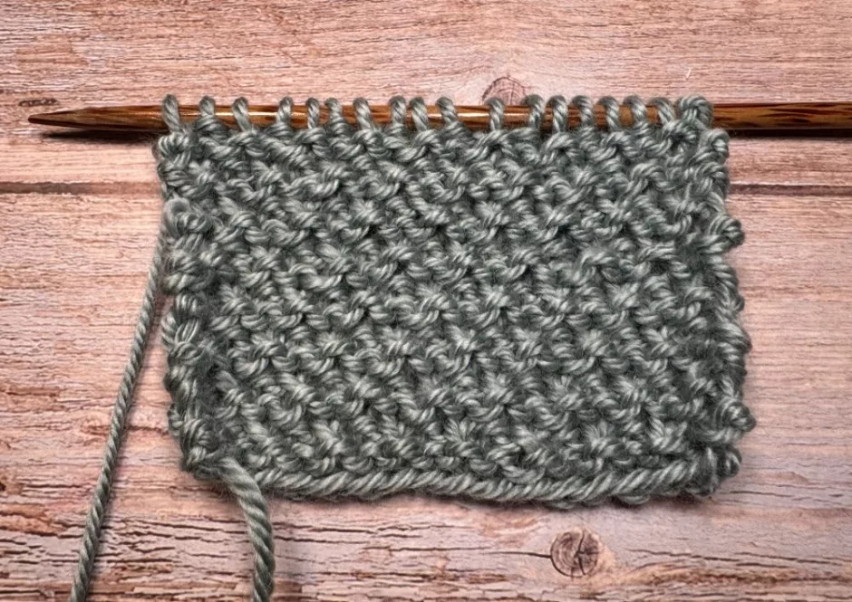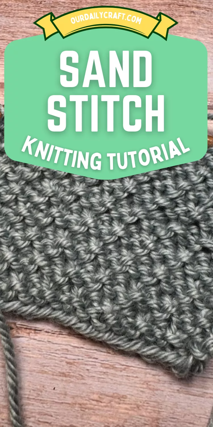 There are actually a couple of different variations on this kind of stitch pattern that I have seen referred to as sand stitch. Some are just a two-row repeat, and some use four rows.