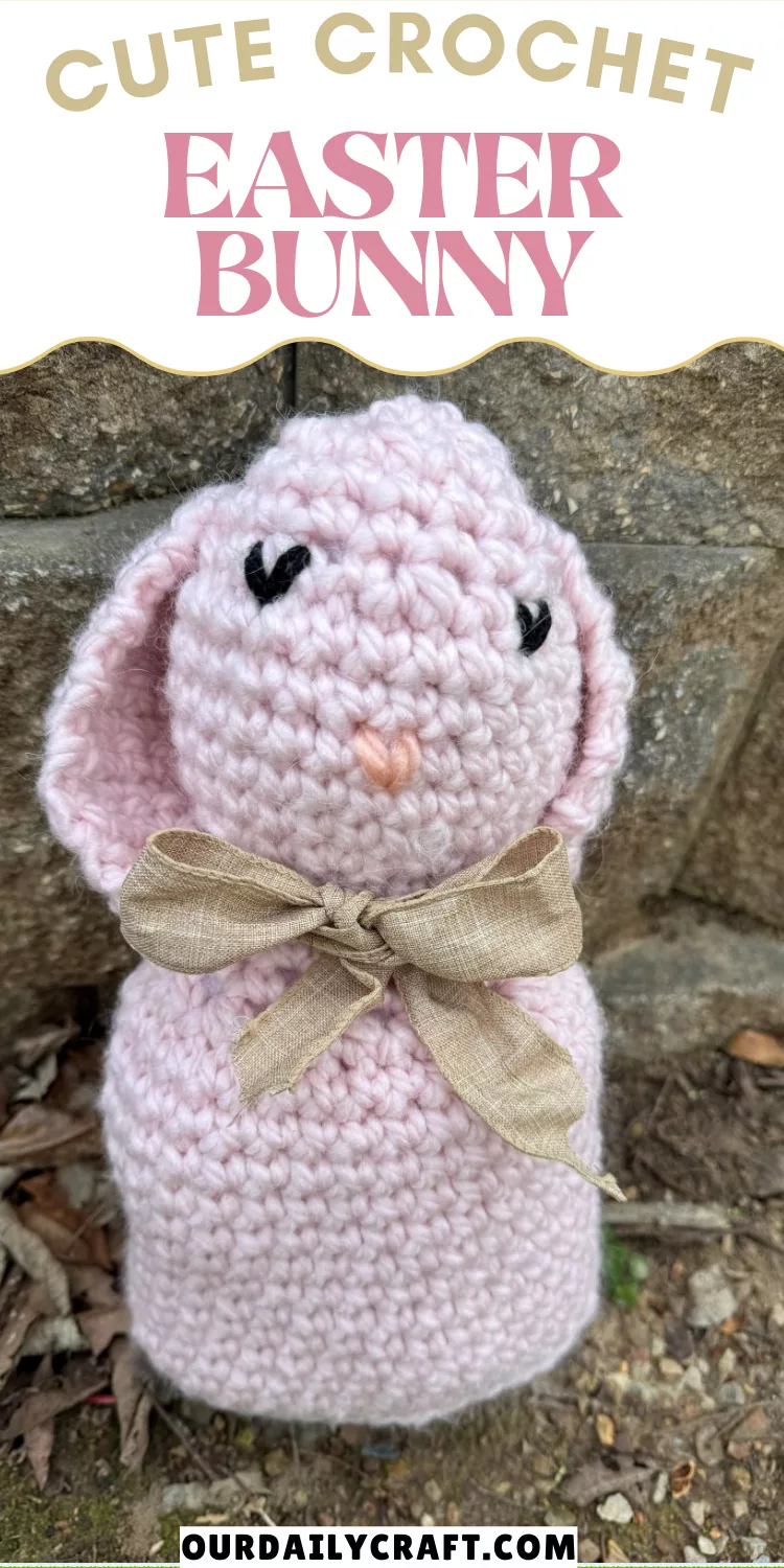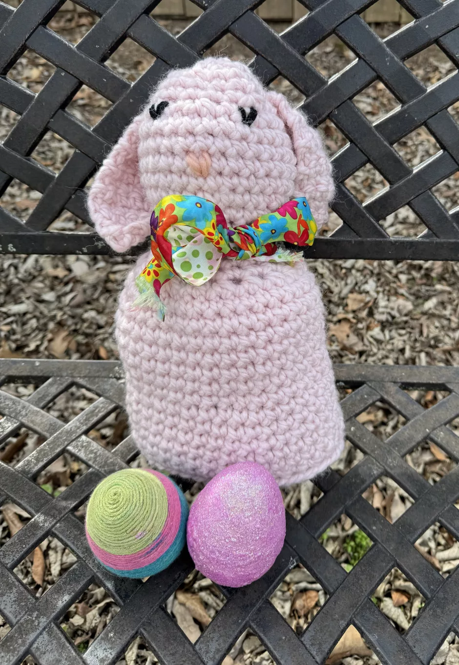 This crochet bunny was a lot of fun to make, and it’s super cute with a ribbon tied around its neck. You could also finger knit a scarf for it, or crochet a flower to put on it, or whatever other accessories you might like.