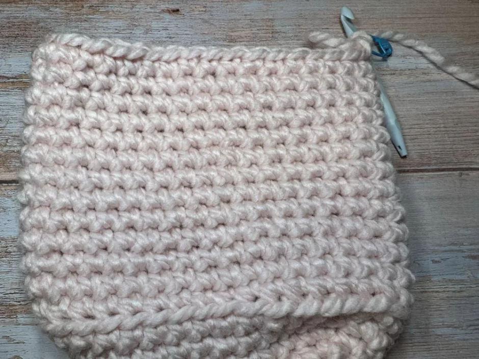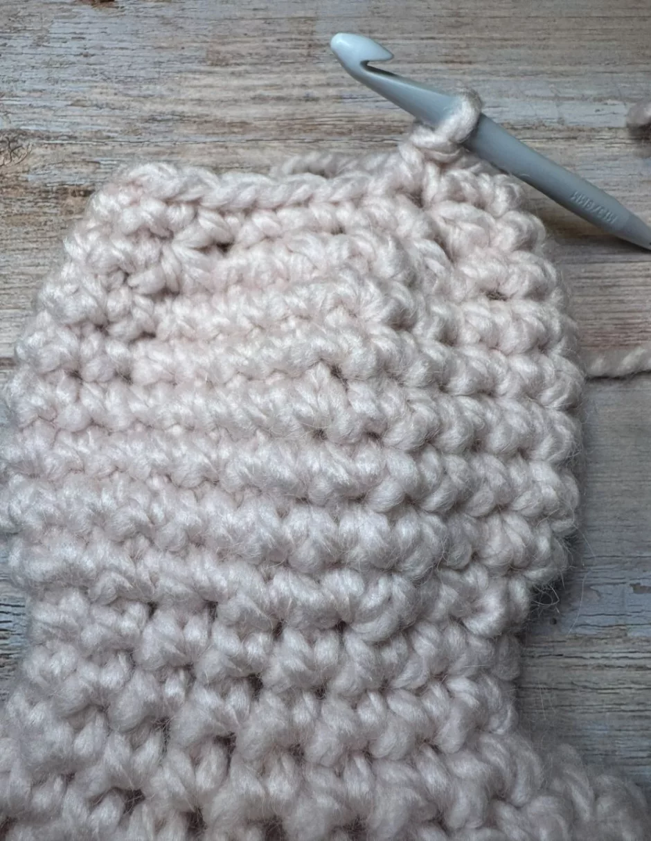 On the next round, single crochet 2 in the first stitch, single crochet to the marked stitch, work 2 single crochets in the marked stitch and the next stitch, single crochet to the last stitch, work 2 single crochets in the last stitch. 30 stitches.