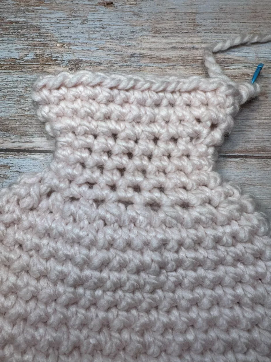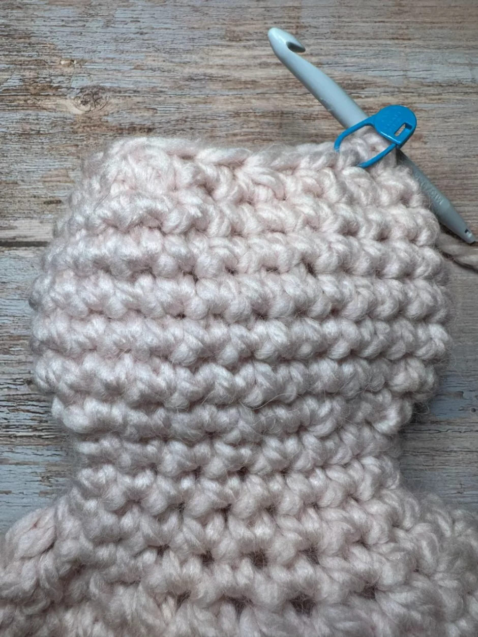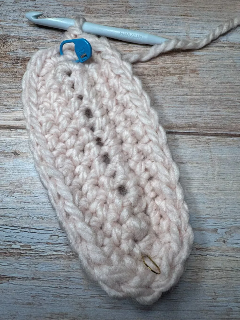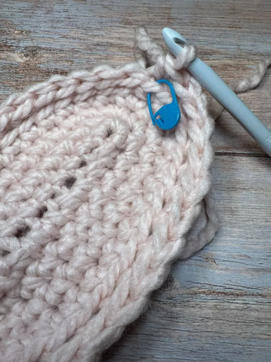 Place a stitch marker in the last stitch of the round and the second stitch of each of the two double crochets on the other side.