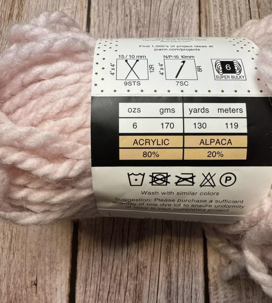 It was a blend of acrylic and alpaca made for Joann by Premier Yarns. They don’t have a similar one, but their Parfait Chunky, which is a blanket style yarn, would be a fun option. Both Bernat Softee Chunky and Premier Basix have a similar looking texture to the yarn I used. The color is pale pink but any pastel would do.