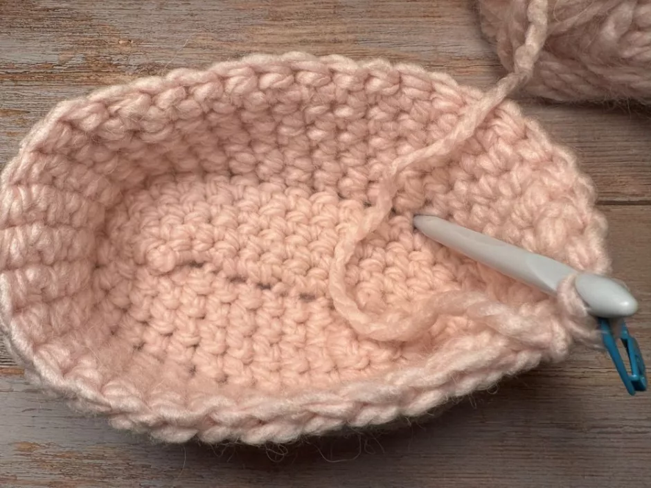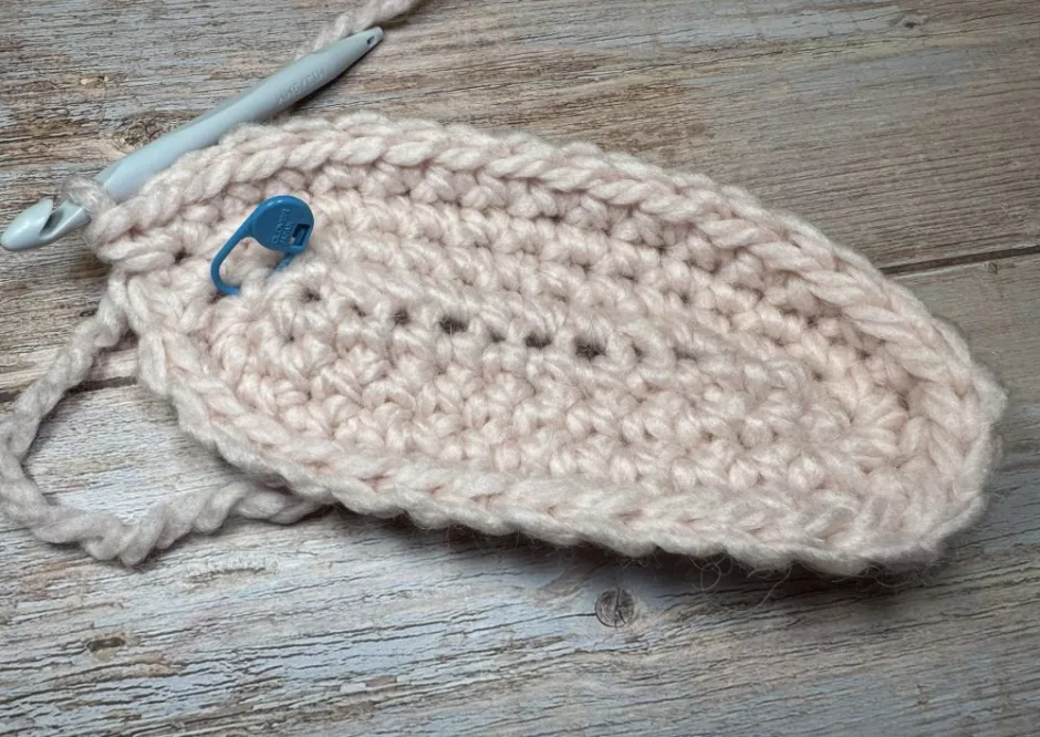 Move your stitch markers up and repeat the last round, working an increase in the first and last stitches as well as twice in the curve on the other side of the oval. You will have 34 stitches.