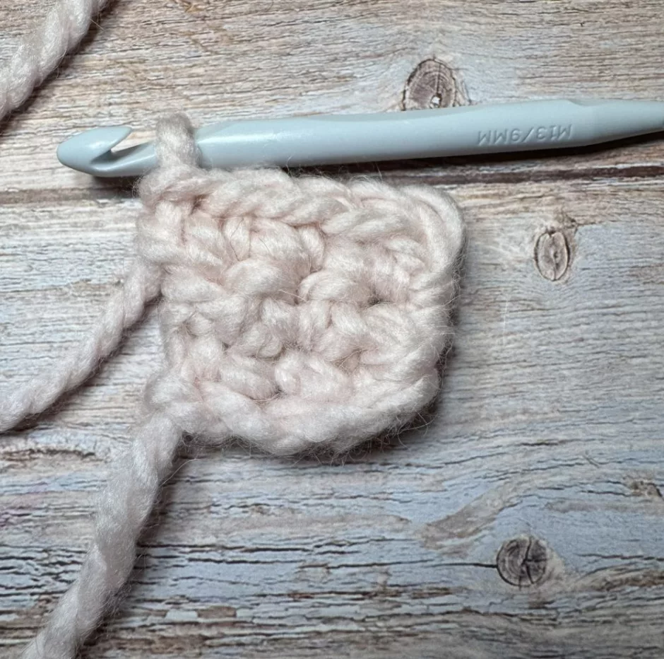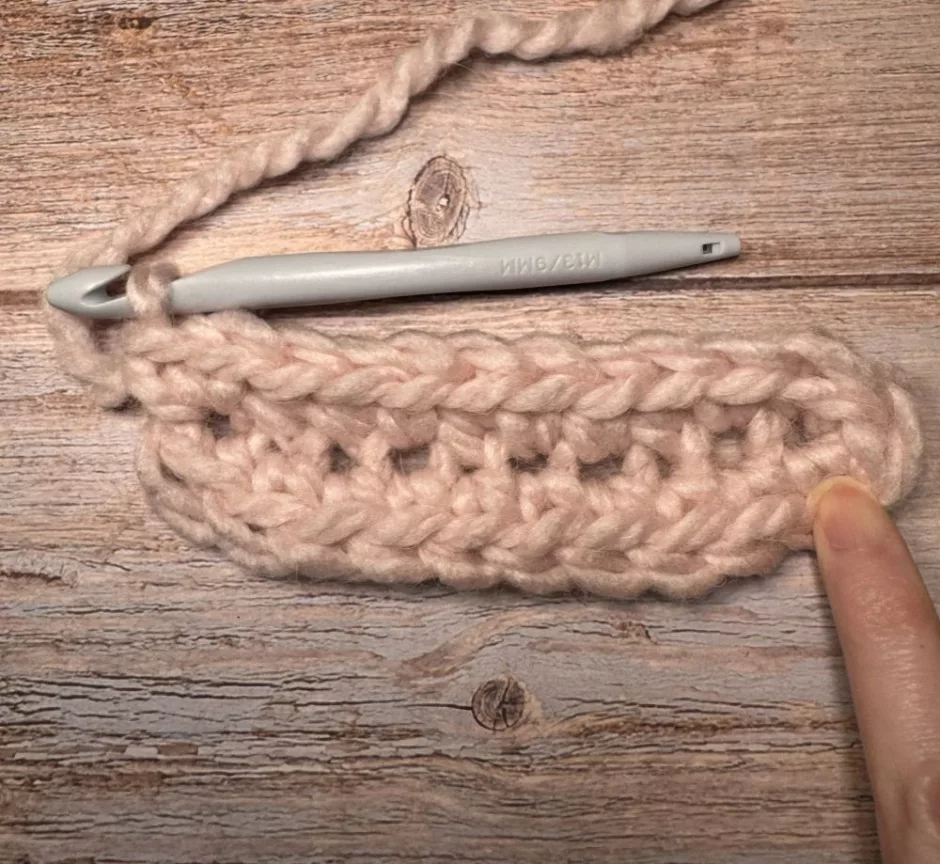 Turn the chain to the right so you can work into the other side of the chain and repeat (9 single crochets, then 2 in the last chain). You’ll have 22 stitches total.