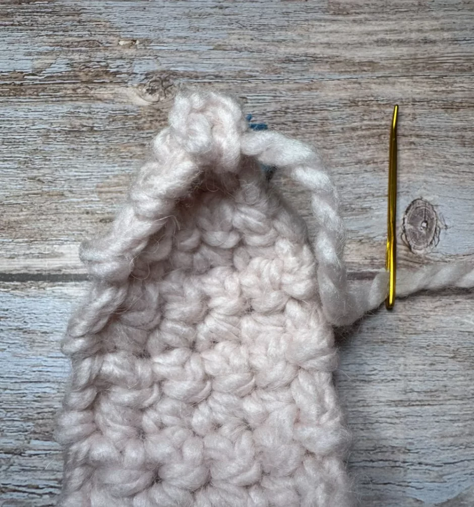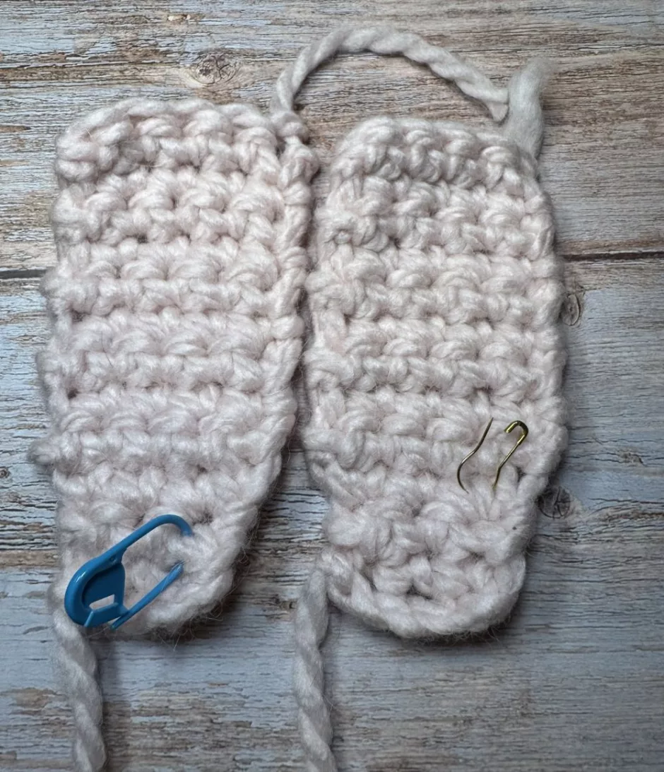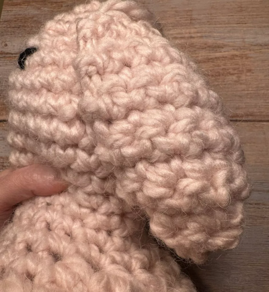 Make another ear the same way. I was so close to out of yarn I actually worked a slip stitch as the last stitch instead of a single crochet but when it’s sewn to the head you can’t tell.