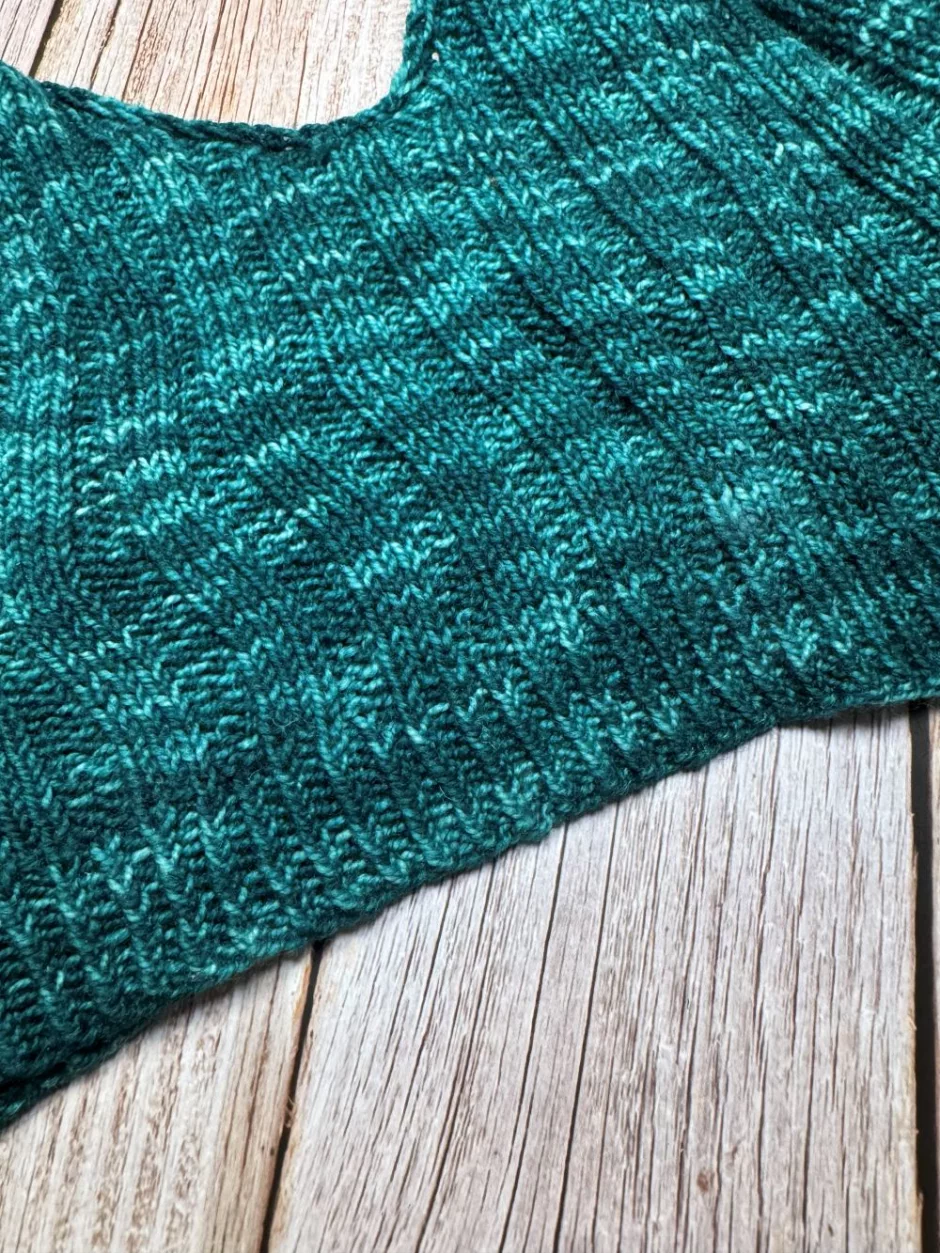 Thread the elastic on the needle and start running it through the stitches on the back of the work. I went through the right leg of each knit stitch on the inside of the top, about halfway down the ribbing. You can also put in more than one strand if you need more stability.