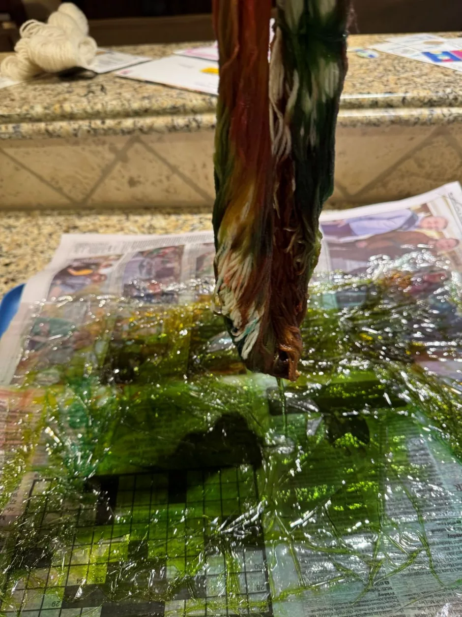 Pull the yarn out of the dye mess and allow it to drain a bit, then put it in a bucket.
