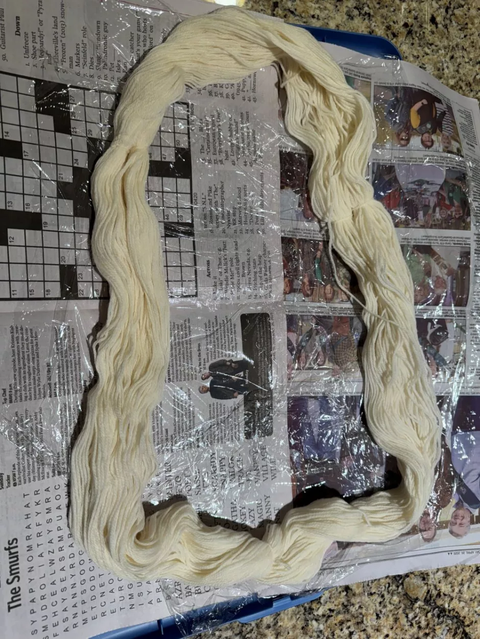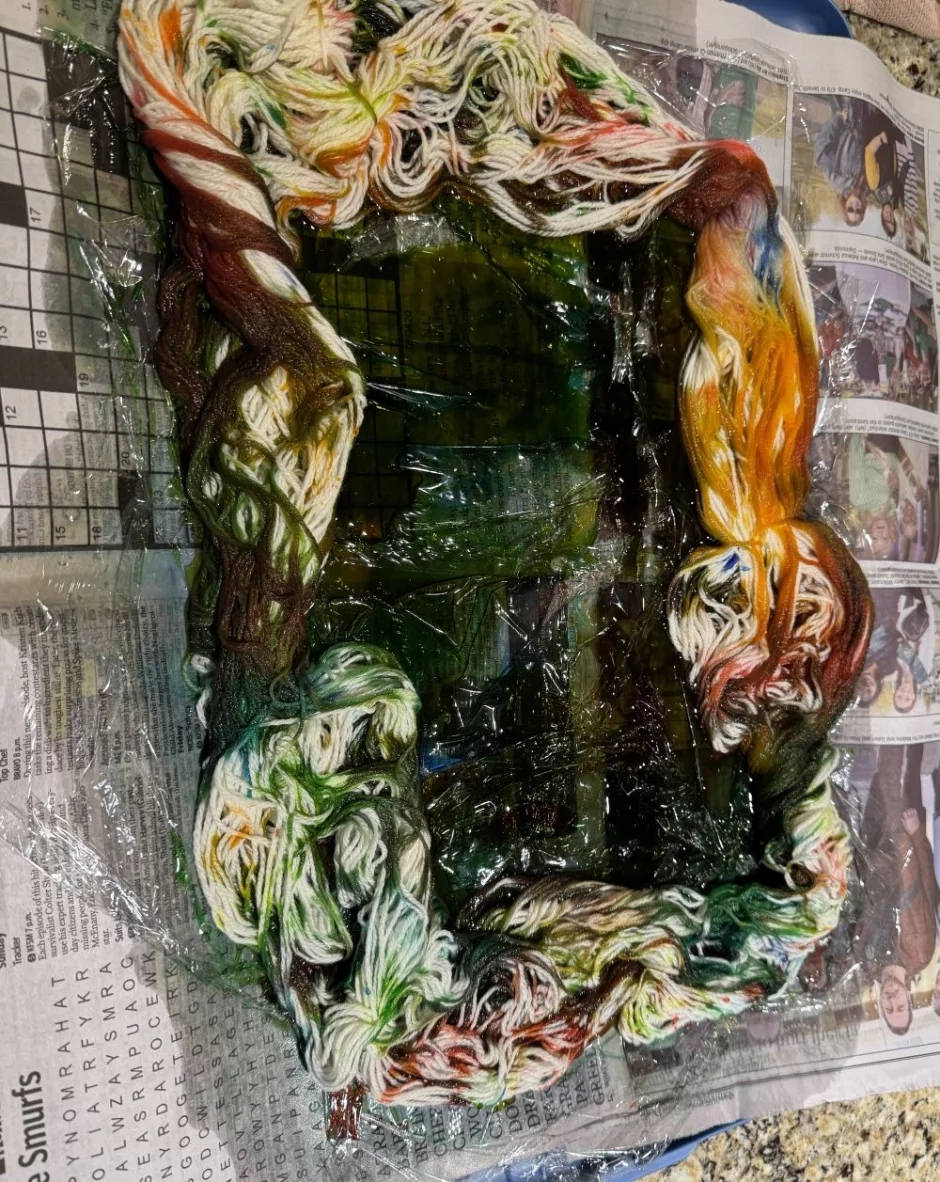 When the yarn water is clear, empty the water from the bucket. Take the yarn out and rearrange it as needed to make it look like a hank again. You can gently squeeze out a little more water at this point.