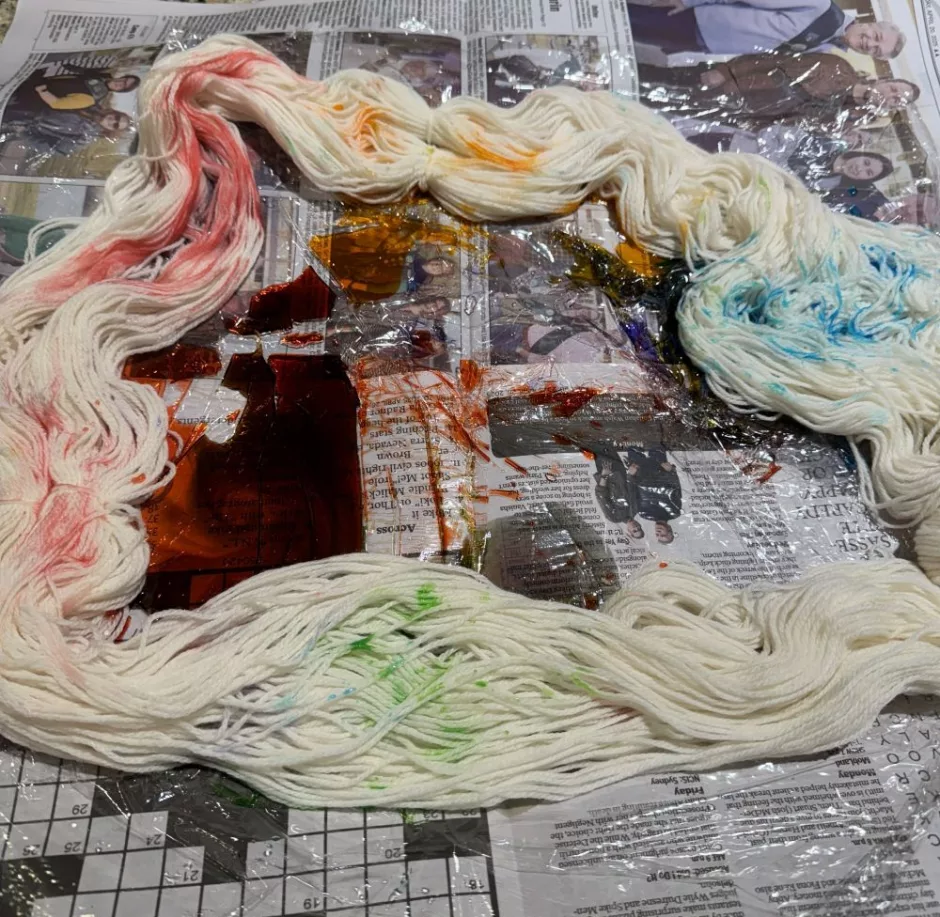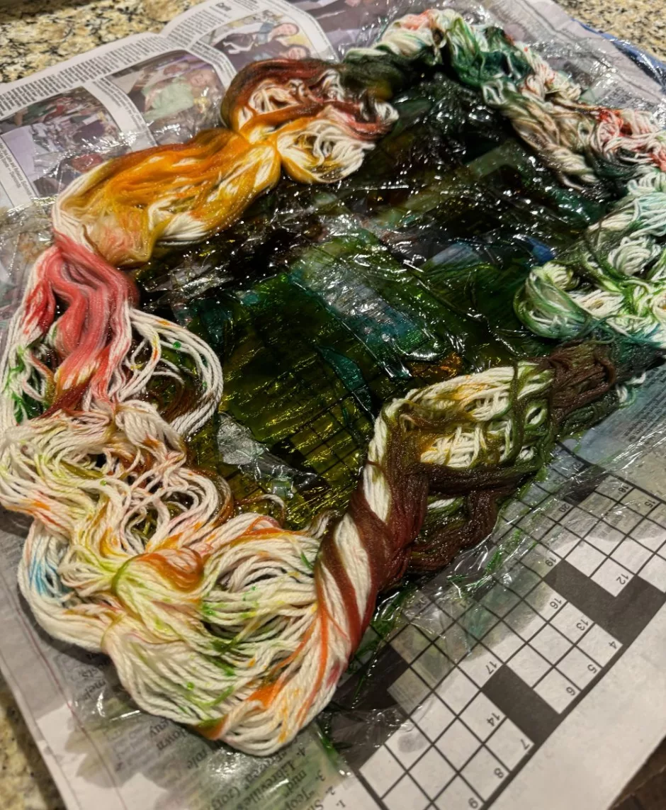 The goal is to get to clear water when you rinse or soak the yarn. This is a process and will take longer than the dyeing itself. Be patient and persistent because you don’t want the dye coming off on you while you knit or use the yarn.