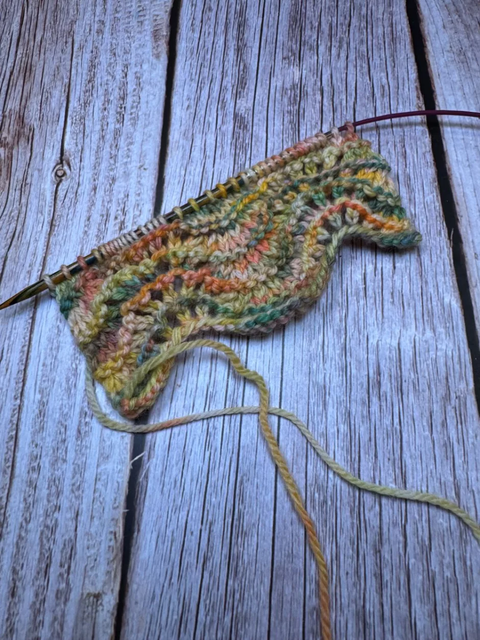And different again when knitting with it. This is a sample of feather and fan, which soon will be a pretty spring scarf.