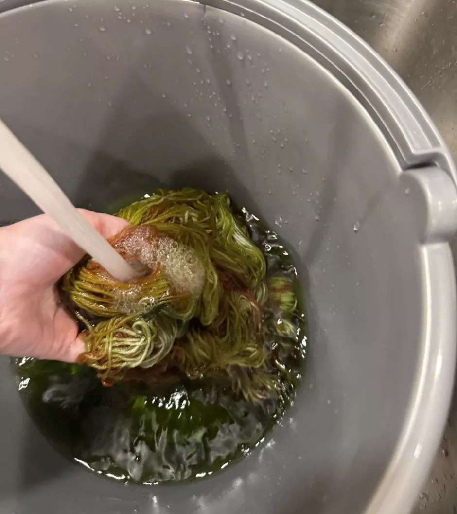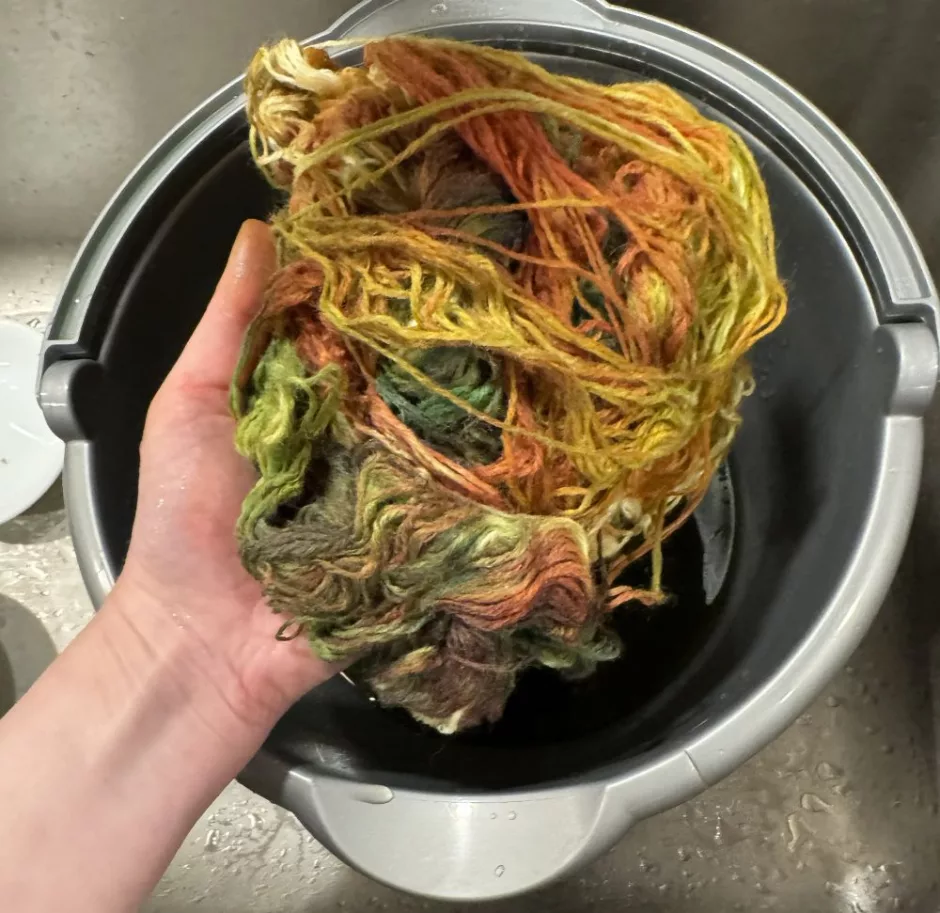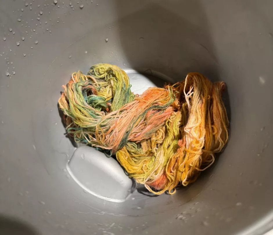 Rinse the yarn under cool water to begin to remove the excess dye. I did this in a bucket in my kitchen sink.