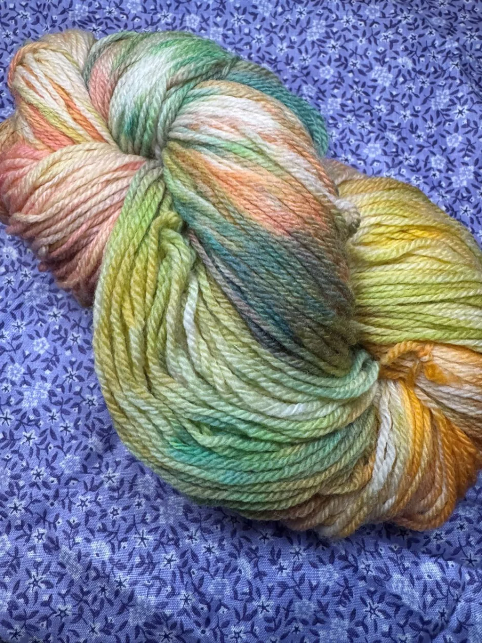 The easiest yarn to dye at home without special equipment or dyes is 100 percent wool yarn in a light color. I think this was Knit Picks Swish Fingering, which is a 100 percent wool sock yarn, but it was weirdly not 100 grams (more like 68) but was still tied up like an unused hank in my stash when I found it so I really don’t know.