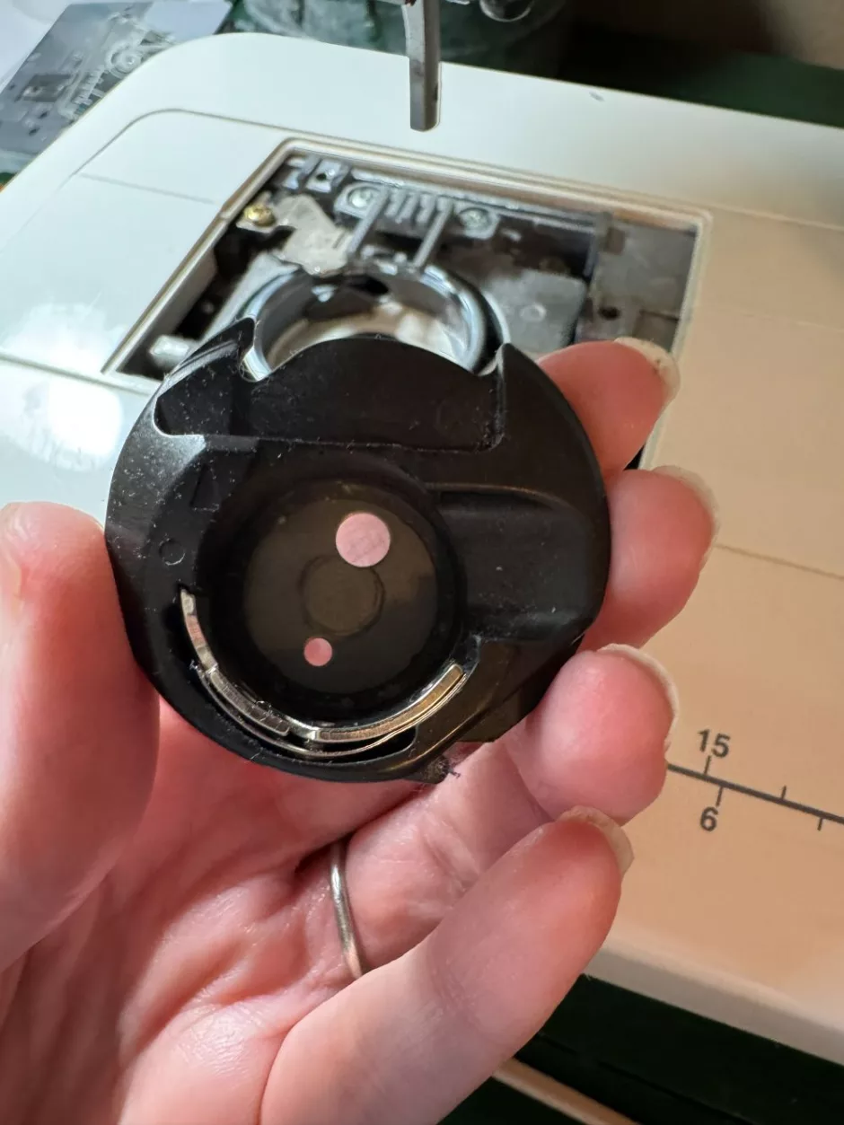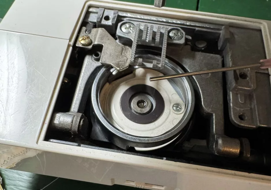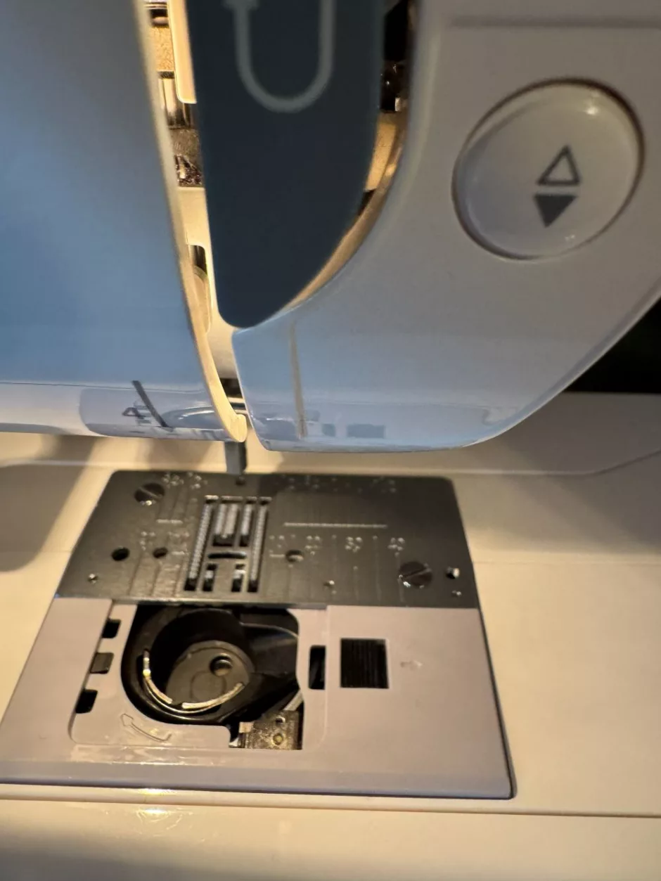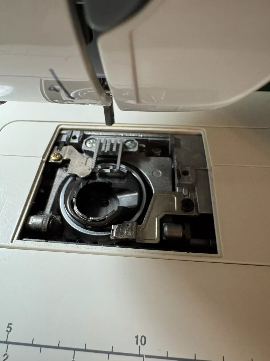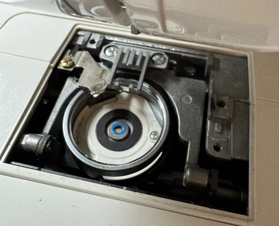 Again, this is a thing where your machine might recommend oiling in different places. My machine’s manual doesn’t address oiling at all, so I just oil this one spot in the bobbin case that looks like a little (very dry at this moment) sponge. It’s circled in blue above.
