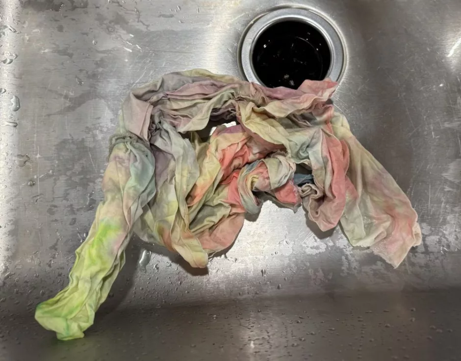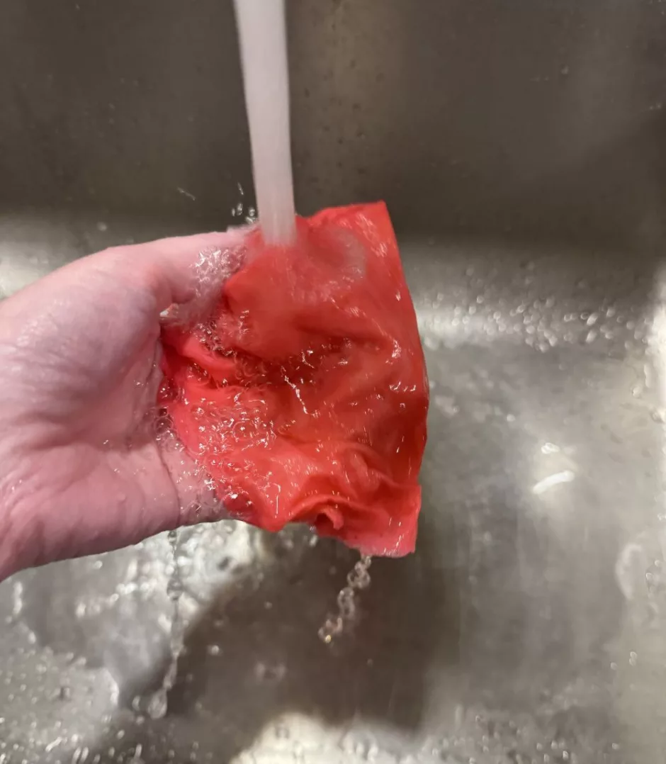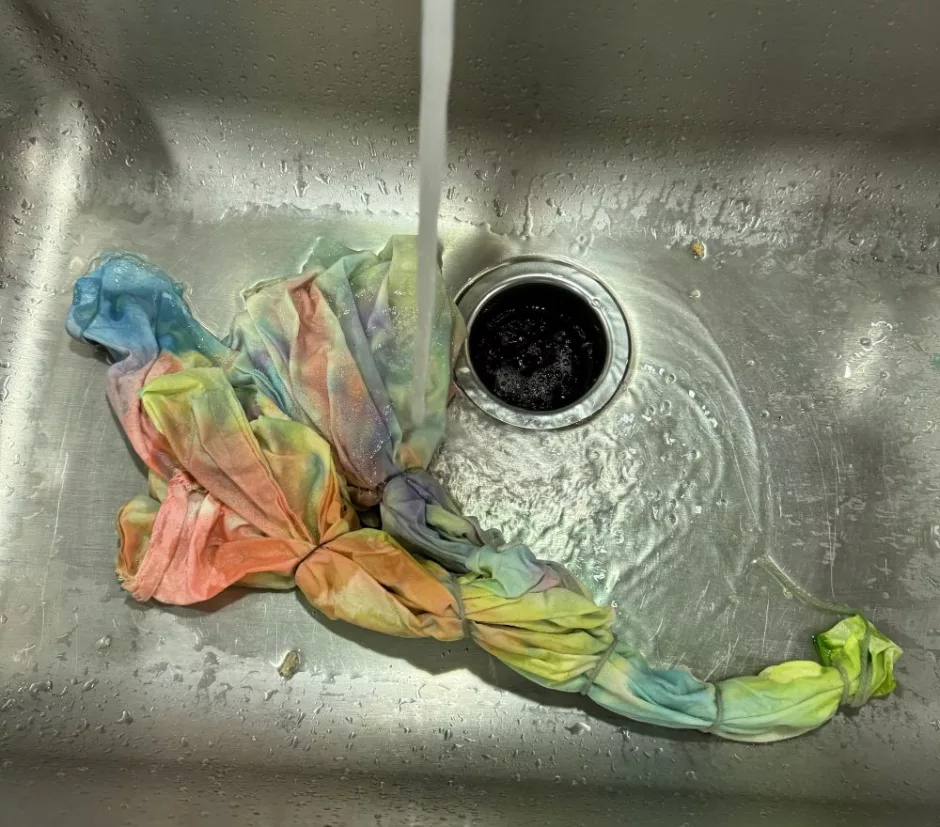 Rinse with cool water and squeeze the fabric as you rinse. Keep rinsing until the water runs clear.